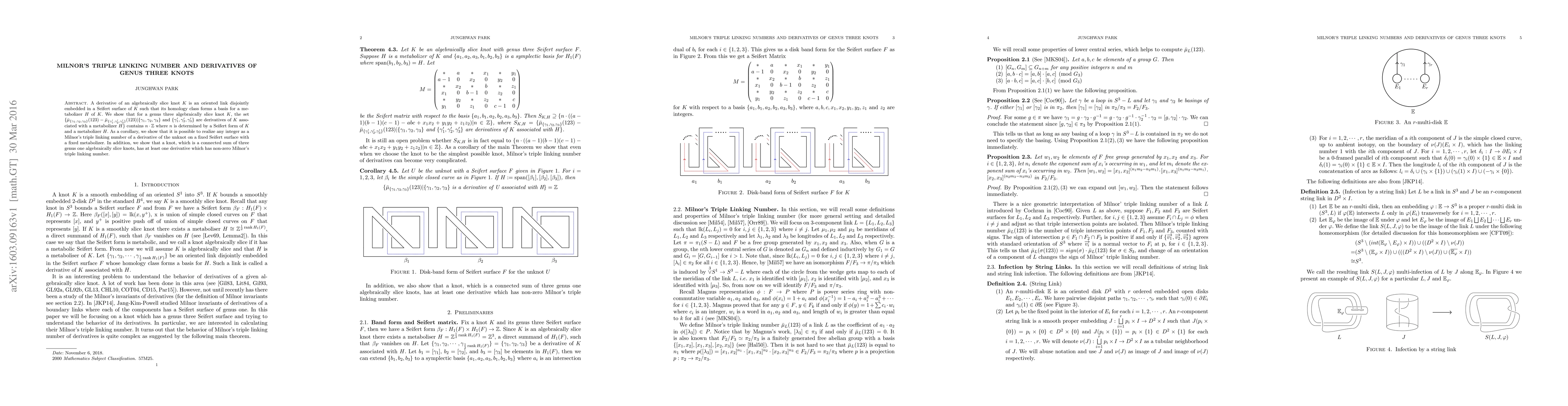 This paper demonstrates that for genus three algebraically slice knots, the differences in Milnor's triple linking numbers of their derivatives form an integer multiple set determined by the knot's Seifert form and a chosen metabolizer. It also proves that any integer can be realized as a triple linking number for derivatives of the unknot on a fixed surface, and shows that certain connected sums of genus one slice knots have derivatives with non-zero triple linking numbers.