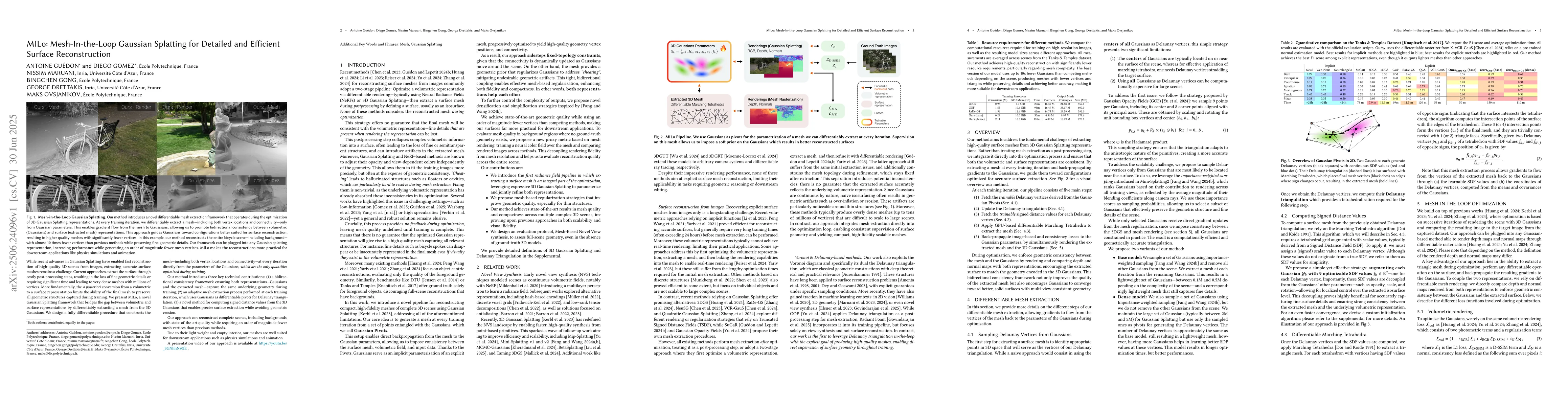 While recent advances in Gaussian Splatting have enabled fast reconstruction of high-quality 3D scenes from images, extracting accurate surface meshes remains a challenge. Current approaches extract the surface through costly post-processing steps, resulting in the loss of fine geometric details or requiring significant time and leading to very dense meshes with millions of vertices. More fundamentally, the a posteriori conversion from a volumetric to a surface representation limits the ability of the final mesh to preserve all geometric structures captured during training. We present MILo, a novel Gaussian Splatting framework that bridges the gap between volumetric and surface representations by differentiably extracting a mesh from the 3D Gaussians. We design a fully differentiable procedure that constructs the mesh-including both vertex locations and connectivity-at every iteration directly from the parameters of the Gaussians, which are the only quantities optimized during training. Our method introduces three key technical contributions: a bidirectional consistency framework ensuring both representations-Gaussians and the extracted mesh-capture the same underlying geometry during training; an adaptive mesh extraction process performed at each training iteration, which uses Gaussians as differentiable pivots for Delaunay triangulation; a novel method for computing signed distance values from the 3D Gaussians that enables precise surface extraction while avoiding geometric erosion. Our approach can reconstruct complete scenes, including backgrounds, with state-of-the-art quality while requiring an order of magnitude fewer mesh vertices than previous methods. Due to their light weight and empty interior, our meshes are well suited for downstream applications such as physics simulations or animation.