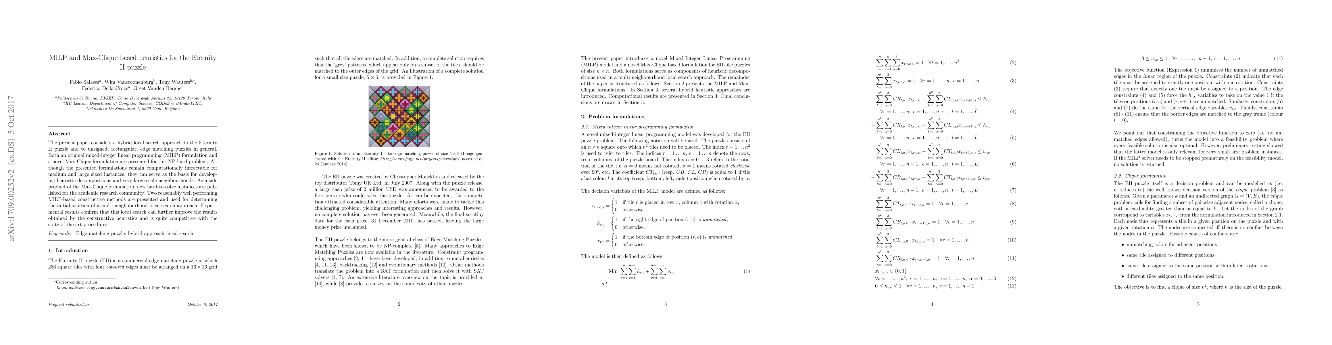 This paper introduces a hybrid method using MILP and Max-Clique formulations to tackle the Eternity II puzzle, a type of edge-matching puzzle. Despite computational challenges for larger instances, these formulations can guide heuristic decompositions. The research also reveals new hard puzzle instances and presents MILP-based constructive methods. Results show the proposed local search improves upon initial constructive solutions and competes with existing methods.