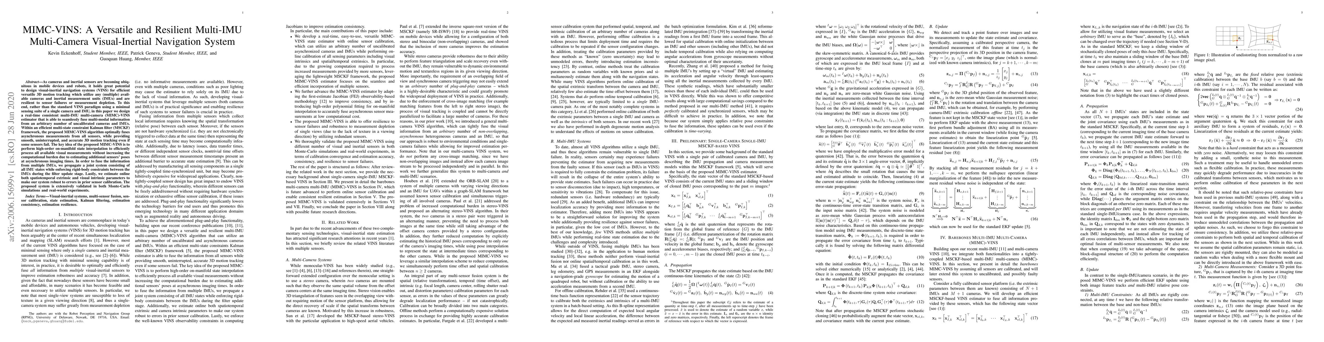 The MIMC-VINS system designs a real-time, multi-IMU multi-camera visual-inertial navigation system that efficiently fuses data from multiple uncalibrated sensors to provide accurate 3D motion tracking, even in the event of sensor failure, leveraging high-order on-manifold state interpolation and a multi-state constraint Kalman filter framework.