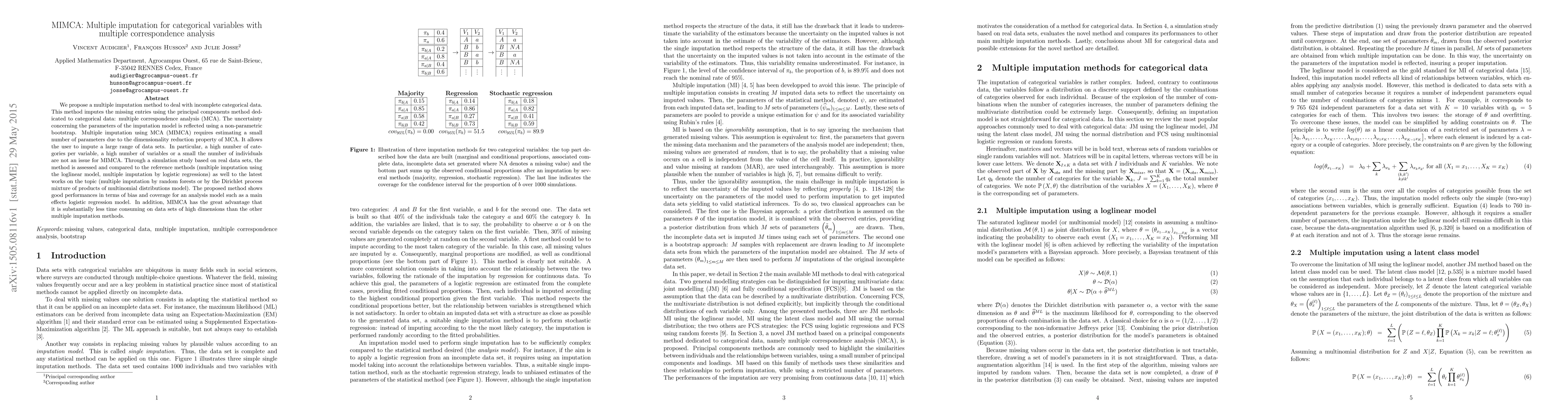 The paper proposes MIMCA, a multiple imputation method for incomplete categorical data using multiple correspondence analysis, which efficiently handles high-dimensional datasets with many categories. Through simulations, MIMCA demonstrates good performance in bias and coverage, and is notably less time-consuming compared to other imputation methods.