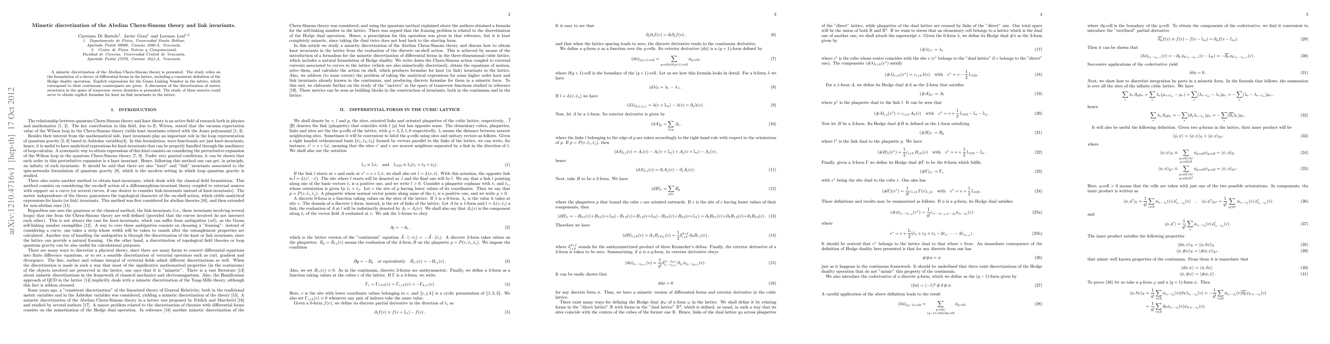 This paper presents a mimetic discretization of Abelian Chern-Simons theory, formulating differential forms on a lattice with consistent Hodge duality. It provides expressions for Gauss Linking Numbers and discusses metric structures for deriving lattice-based knot and link invariants.