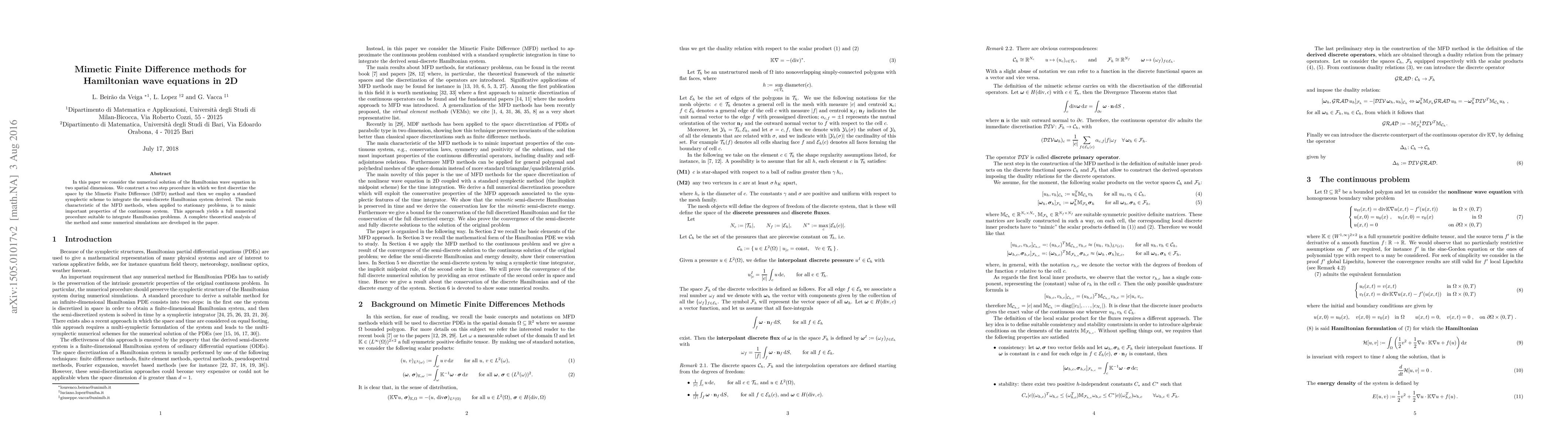 This paper proposes a Mimetic Finite Difference (MFD) method combined with symplectic integration for solving Hamiltonian wave equations in two dimensions. The MFD method mimics properties of the continuous system, and the symplectic integration ensures the numerical method is suitable for Hamiltonian problems, supported by theoretical analysis and numerical simulations.