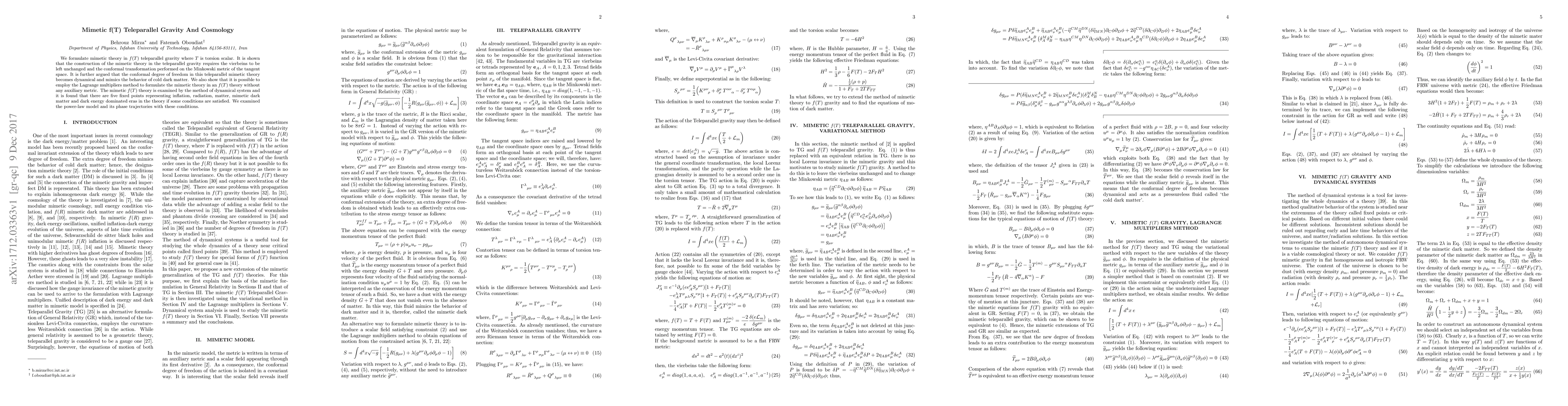 This paper develops a mimetic theory in the context of f(T) teleparallel gravity, demonstrating that the conformal degree of freedom mimics cold dark matter and identifies five fixed points representing different cosmological eras through dynamical system analysis. It also explores the use of Lagrange multipliers to formulate the theory without auxiliary metrics.
