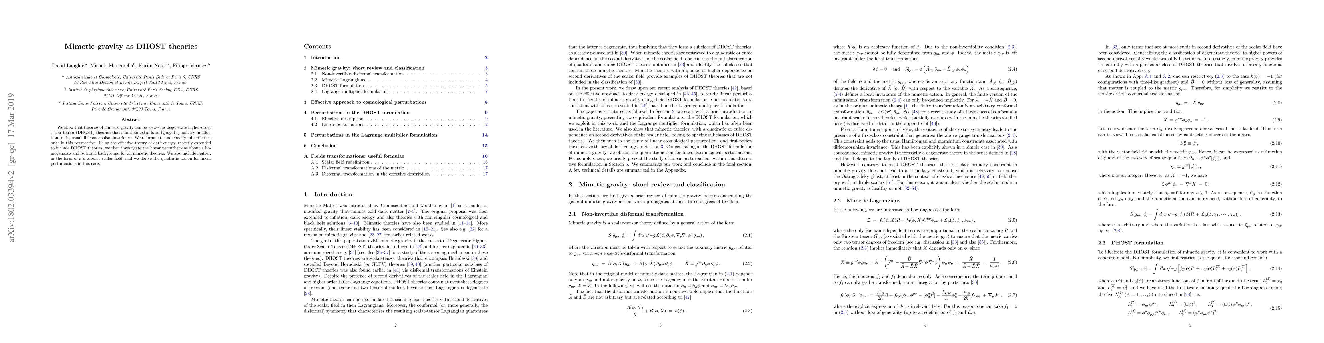 We show that theories of mimetic gravity can be viewed as degenerate higher-order scalar-tensor (DHOST) theories that admit an extra local (gauge) symmetry in addition to the usual diffeomorphism invariance. We reformulate and classify mimetic theories in this perspective. Using the effective theory of dark energy, recently extended to include DHOST theories, we then investigate the linear perturbations about a homogeneous and isotropic background for all mimetic theories. We also include matter, in the form of a $k$-essence scalar field, and we derive the quadratic action for linear perturbations in this case.