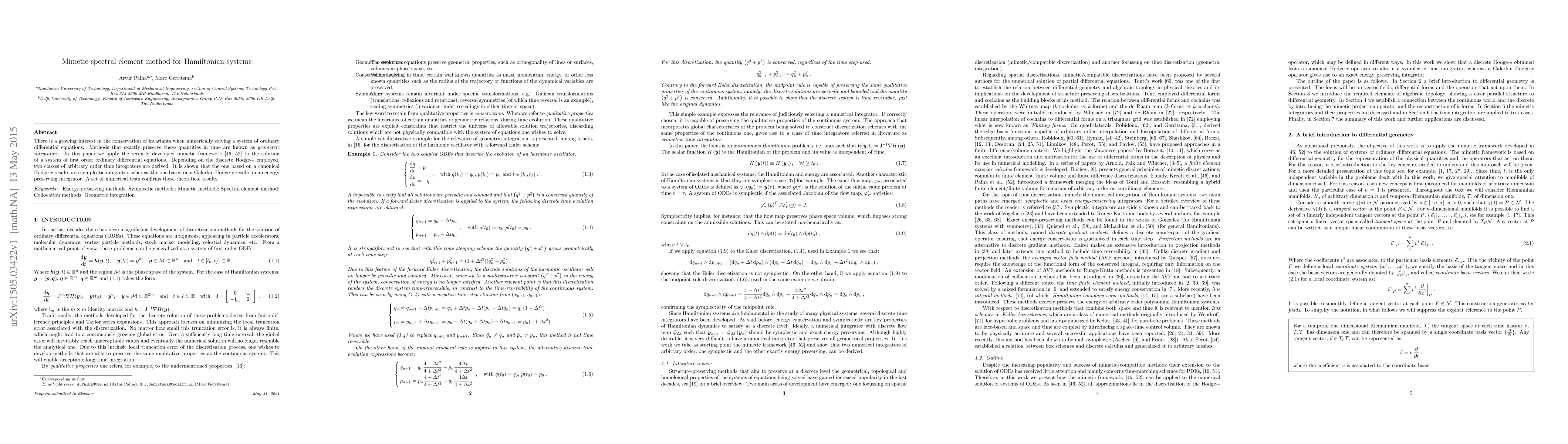 This paper introduces the Mimetic Spectral Element Method for Hamiltonian systems, deriving two classes of arbitrary order time integrators based on discrete Hodge-* operators. One class results in symplectic integrators preserving invariants exactly, while the other ensures energy preservation. Numerical tests validate these theoretical findings.
