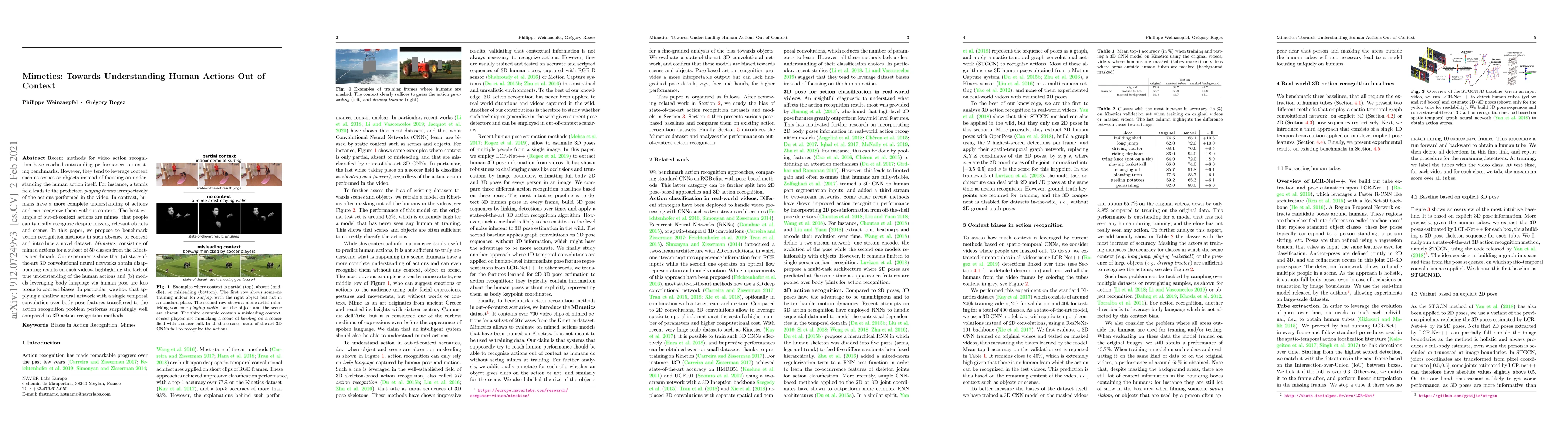 Recent methods for video action recognition have reached outstanding performances on existing benchmarks. However, they tend to leverage context such as scenes or objects instead of focusing on understanding the human action itself. For instance, a tennis field leads to the prediction playing tennis irrespectively of the actions performed in the video. In contrast, humans have a more complete understanding of actions and can recognize them without context. The best example of out-of-context actions are mimes, that people can typically recognize despite missing relevant objects and scenes. In this paper, we propose to benchmark action recognition methods in such absence of context and introduce a novel dataset, Mimetics, consisting of mimed actions for a subset of 50 classes from the Kinetics benchmark. Our experiments show that (a) state-of-the-art 3D convolutional neural networks obtain disappointing results on such videos, highlighting the lack of true understanding of the human actions and (b) models leveraging body language via human pose are less prone to context biases. In particular, we show that applying a shallow neural network with a single temporal convolution over body pose features transferred to the action recognition problem performs surprisingly well compared to 3D action recognition methods.
