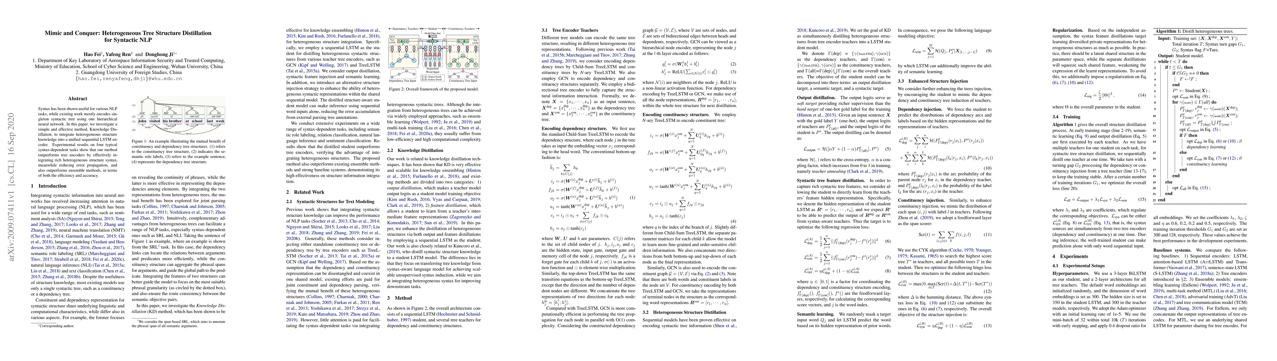 This paper proposes a Knowledge Distillation method to integrate heterogeneous syntactic tree structures into a sequential LSTM encoder, achieving better performance on syntax-dependent NLP tasks compared to traditional tree encoders and ensemble methods, while enhancing efficiency and accuracy.