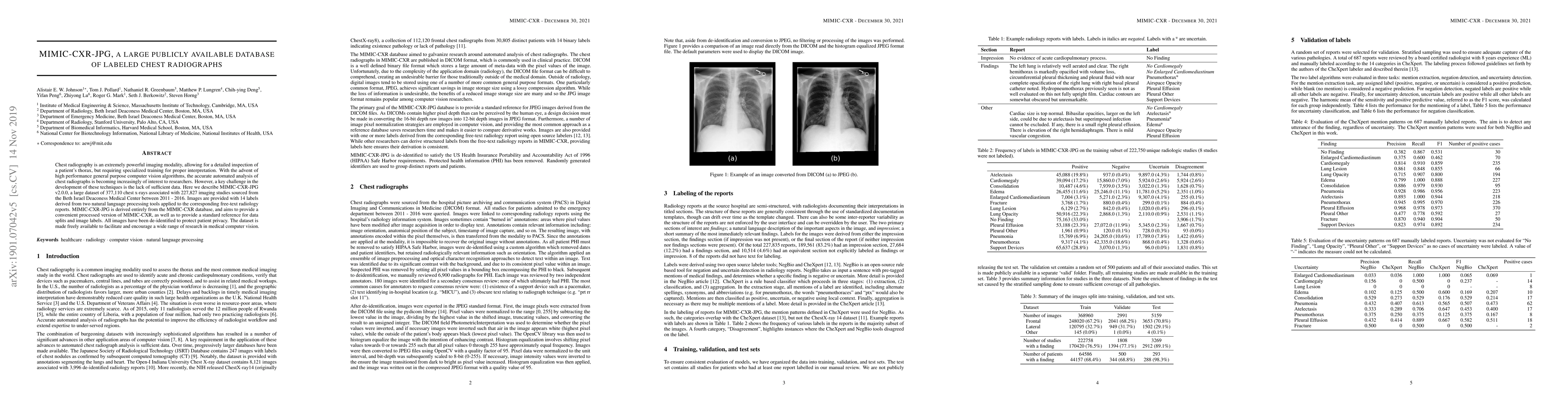 MIMIC-CXR-JPG v2.0.0 is a large publicly accessible dataset of 377,110 labeled chest x-rays from 227,827 imaging studies, aimed at advancing medical computer vision research. The dataset includes 14 labels derived from radiology reports and is de-identified to protect patient privacy.