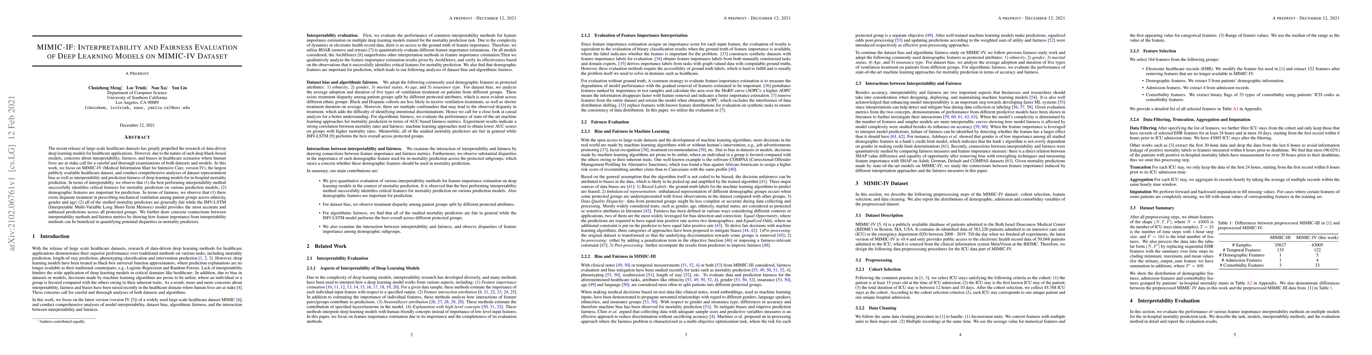 The recent release of large-scale healthcare datasets has greatly propelled the research of data-driven deep learning models for healthcare applications. However, due to the nature of such deep black-boxed models, concerns about interpretability, fairness, and biases in healthcare scenarios where human lives are at stake call for a careful and thorough examinations of both datasets and models. In this work, we focus on MIMIC-IV (Medical Information Mart for Intensive Care, version IV), the largest publicly available healthcare dataset, and conduct comprehensive analyses of dataset representation bias as well as interpretability and prediction fairness of deep learning models for in-hospital mortality prediction. In terms of interpretabilty, we observe that (1) the best performing interpretability method successfully identifies critical features for mortality prediction on various prediction models; (2) demographic features are important for prediction. In terms of fairness, we observe that (1) there exists disparate treatment in prescribing mechanical ventilation among patient groups across ethnicity, gender and age; (2) all of the studied mortality predictors are generally fair while the IMV-LSTM (Interpretable Multi-Variable Long Short-Term Memory) model provides the most accurate and unbiased predictions across all protected groups. We further draw concrete connections between interpretability methods and fairness metrics by showing how feature importance from interpretability methods can be beneficial in quantifying potential disparities in mortality predictors.