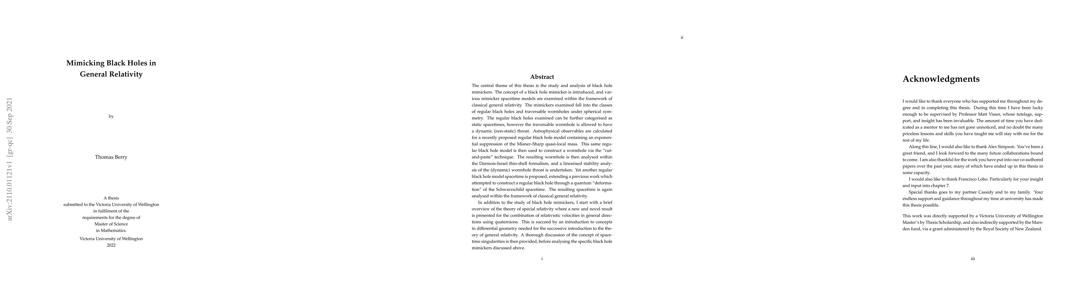 The central theme of this thesis is the study and analysis of black hole mimickers. The concept of a black hole mimicker is introduced, and various mimicker spacetime models are examined within the framework of classical general relativity. The mimickers examined fall into the classes of regular black holes and traversable wormholes under spherical symmetry. The regular black holes examined can be further categorised as static spacetimes, however the traversable wormhole is allowed to have a dynamic (non-static) throat. Astrophysical observables are calculated for a recently proposed regular black hole model containing an exponential suppression of the Misner-Sharp quasi-local mass. This same regular black hole model is then used to construct a wormhole via the ''cut- and-paste'' technique. The resulting wormhole is then analysed within the Darmois-Israel thin-shell formalism, and a linearised stability analysis of the (dynamic) wormhole throat is undertaken. Yet another regular black hole model spacetime is proposed, extending a previous work which attempted to construct a regular black hole through a quantum ''deformation'' of the Schwarzschild spacetime. The resulting spacetime is again analysed within the framework of classical general relativity. In addition to the study of black hole mimickers, I start with a brief overview of the theory of special relativity where a new and novel result is presented for the combination of relativistic velocities in general directions using quaternions. This is succeed by an introduction to concepts in differential geometry needed for the successive introduction to the theory of general relativity. A thorough discussion of the concept of spacetime singularities is then provided, before analysing the specific black hole mimickers discussed above.