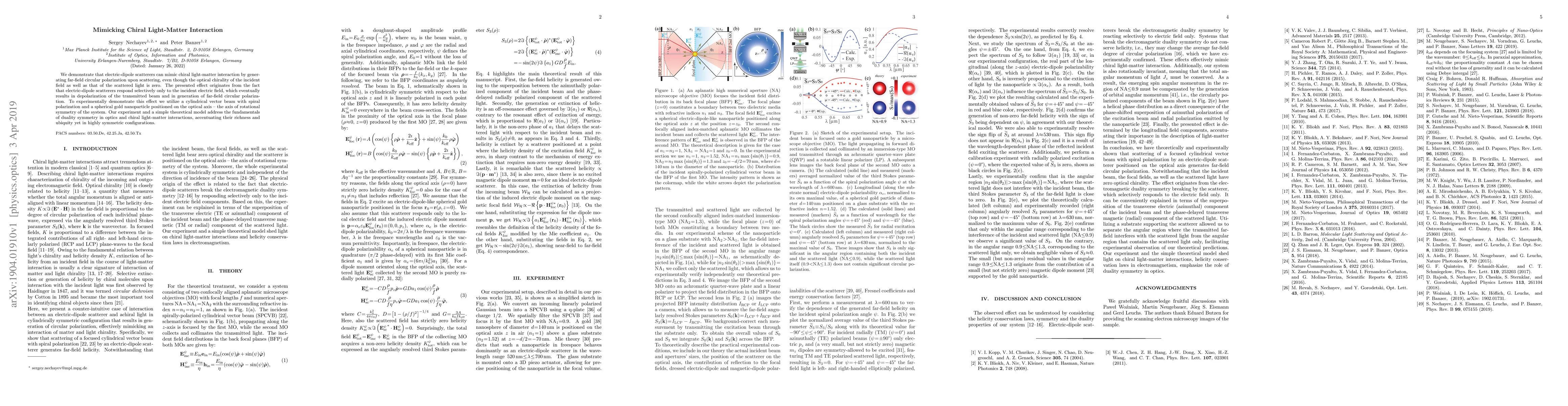 We demonstrate that electric-dipole scatterers can mimic chiral light-matter interaction by generating far-field circular polarization upon scattering, even though the optical chirality of the incident field as well as that of the scattered light is zero. The presented effect originates from the fact that electric-dipole scatterers respond selectively only to the incident electric field, which eventually results in depolarization of the transmitted beam and in generation of far-field circular polarization. To experimentally demonstrate this effect we utilize a cylindrical vector beam with spiral polarization and a spherical gold nanoparticle positioned on the optical axis -- the axis of rotational symmetry of the system. Our experiment and a simple theoretical model address the fundamentals of duality symmetry in optics and chiral light-matter interactions, accentuating their richness and ubiquity yet in highly symmetric configurations.