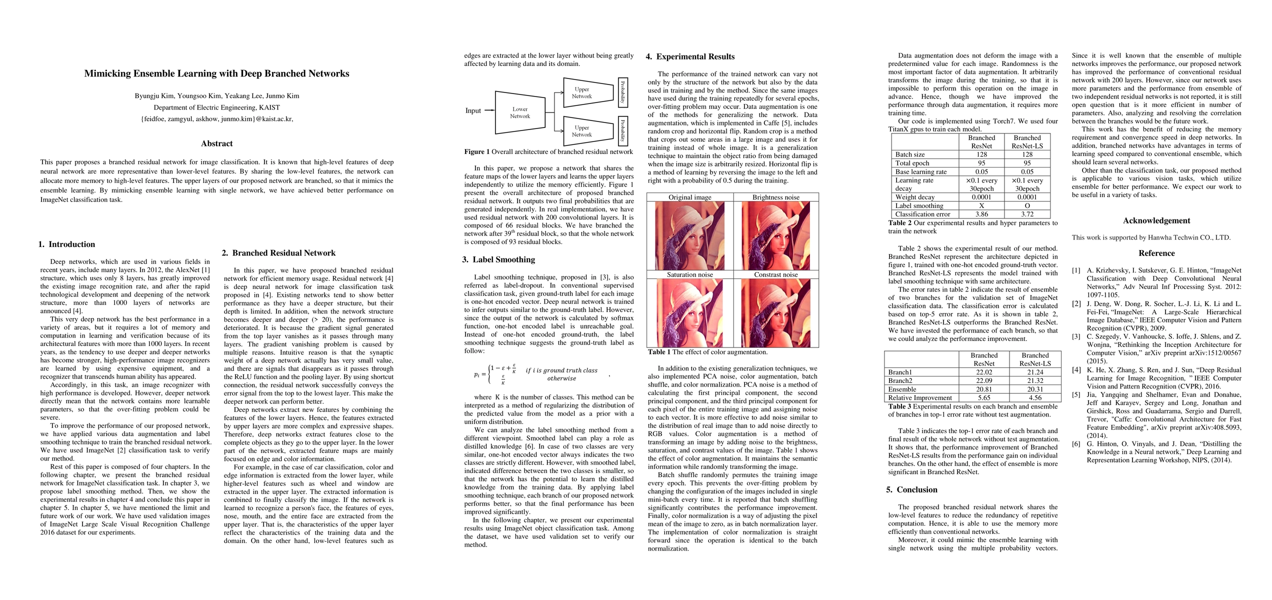 This paper proposes a branched residual network for image classification. It is known that high-level features of deep neural network are more representative than lower-level features. By sharing the low-level features, the network can allocate more memory to high-level features. The upper layers of our proposed network are branched, so that it mimics the ensemble learning. By mimicking ensemble learning with single network, we have achieved better performance on ImageNet classification task.