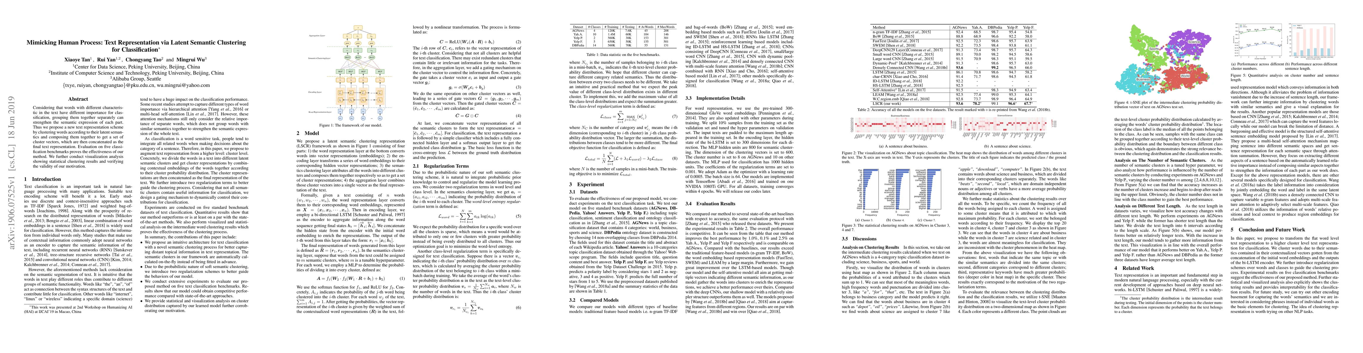 This paper proposes a text representation method that clusters words based on latent semantics to enhance classification. The method creates cluster vectors that are concatenated for final text representation, showing effectiveness on five classification benchmarks and validated through visualization analysis.