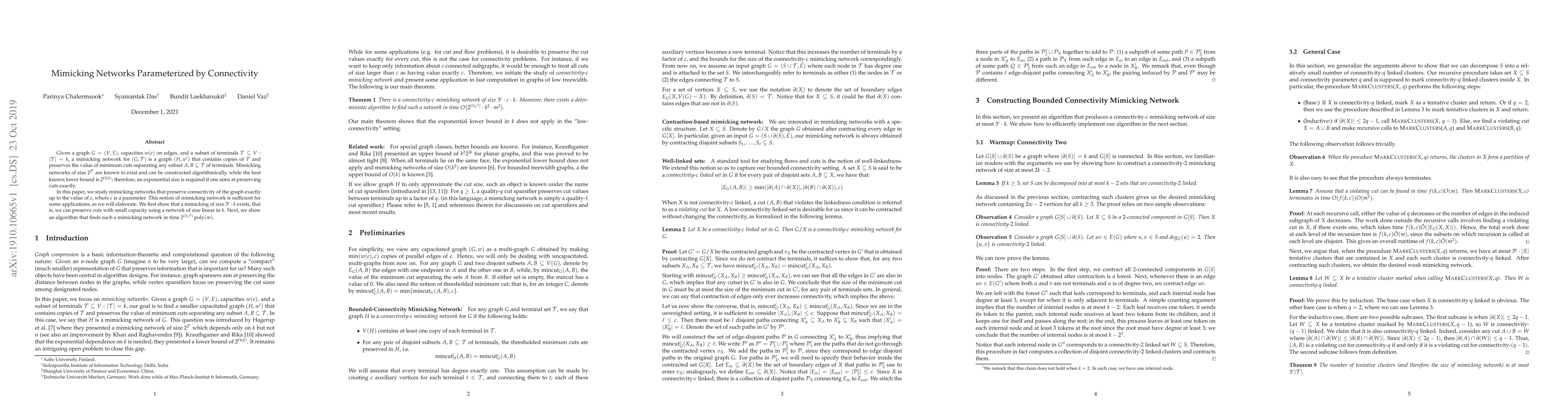 This paper explores mimicking networks that preserve minimum cuts up to a specified capacity parameter $c$, demonstrating the existence of such networks of size $3^c \cdot k$ and presenting an efficient algorithm to construct them in time $2^{O(c^2)} \operatorname{poly}(m)$.