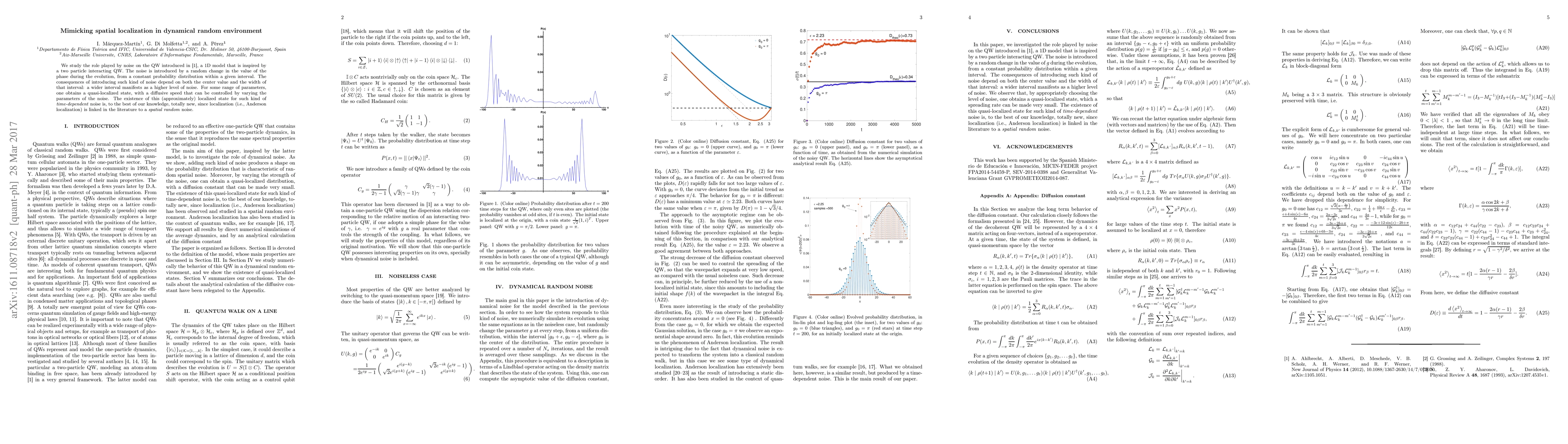 We study the role played by noise on the QW introduced in [1], a 1D model that is inspired by a two particle interacting QW. The noise is introduced by a random change in the value of the phase during the evolution, from a constant probability distribution within a given interval. The consequences of introducing such kind of noise depend on both the center value and the width of that interval: a wider interval manifests as a higher level of noise. For some range of parameters, one obtains a quasi-localized state, with a diffusive speed that can be controlled by varying the parameters of the noise. The existence of this (approximately) localized state for such kind of time-dependent noise is, to the best of our knowledge, totally new, since localization (i.e., Anderson localization) is linked in the literature to a spatial random noise.