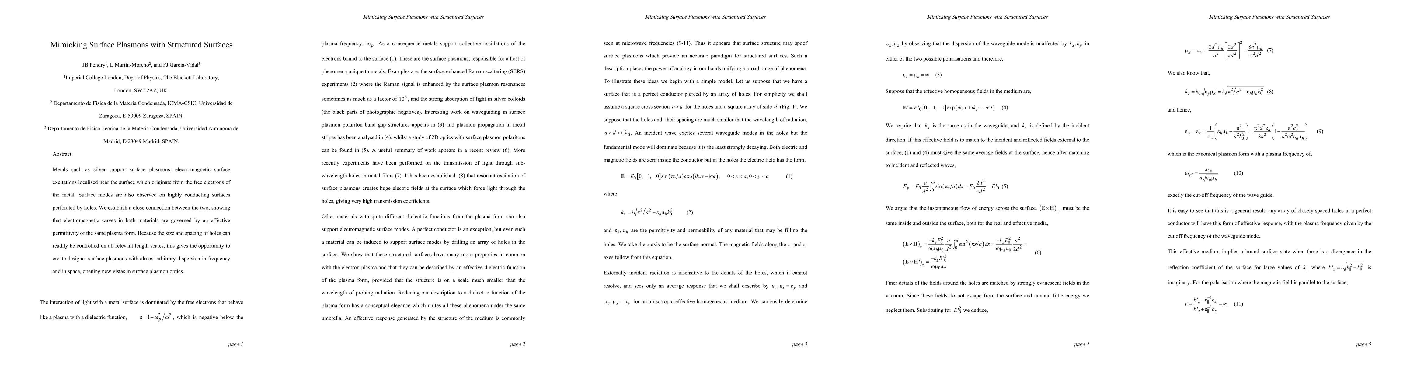 Metals such as silver support surface plasmons: electromagnetic surface excitations localised near the surface which originate from the free electrons of the metal. Surface modes are also observed on highly conducting surfaces perforated by holes. We establish a close connection between the two, showing that electromagnetic waves in both materials are governed by an effective permittivity of the same plasma form. Because the size and spacing of holes can readily be controlled on all relevant length scales, this gives the opportunity to create designer surface plasmons with almost arbitrary dispersion in frequency and in space, opening new vistas in surface plasmon optics.