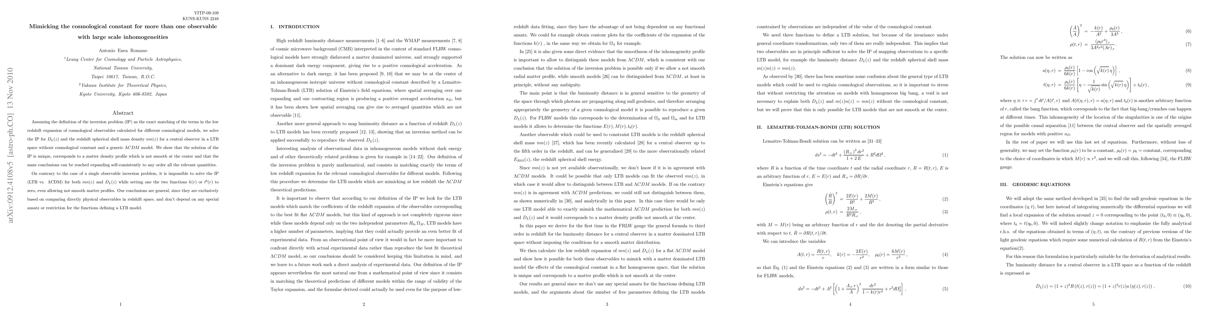 Assuming the definition of the inversion problem (IP) as the exact matching of the terms in the low redshift expansion of cosmological observables calculated for different cosmological models, we solve the IP for $D_L(z)$ and the redshift spherical shell mass density $mn(z)$ for a central observer in a LTB space without cosmological constant and a generic $\Lambda CDM $ model. We show that the solution of the IP is unique, corresponds to a matter density profile which is not smooth at the center and that the same conclusions can be reached expanding self-consistently to any order all the relevant quantities. On contrary to the case of a single observable inversion problem, it is impossible to solve the IP (LTB vs. $\Lambda$CDM) for both $mn(z)$ and $D_L(z)$ while setting one the two functions $k(r)$ or $t^b(r)$ to zero, even allowing not smooth matter profiles. Our conclusions are general, since they are exclusively based on comparing directly physical observables in redshift space, and don't depend on any special ansatz or restriction for the functions defining a LTB model.