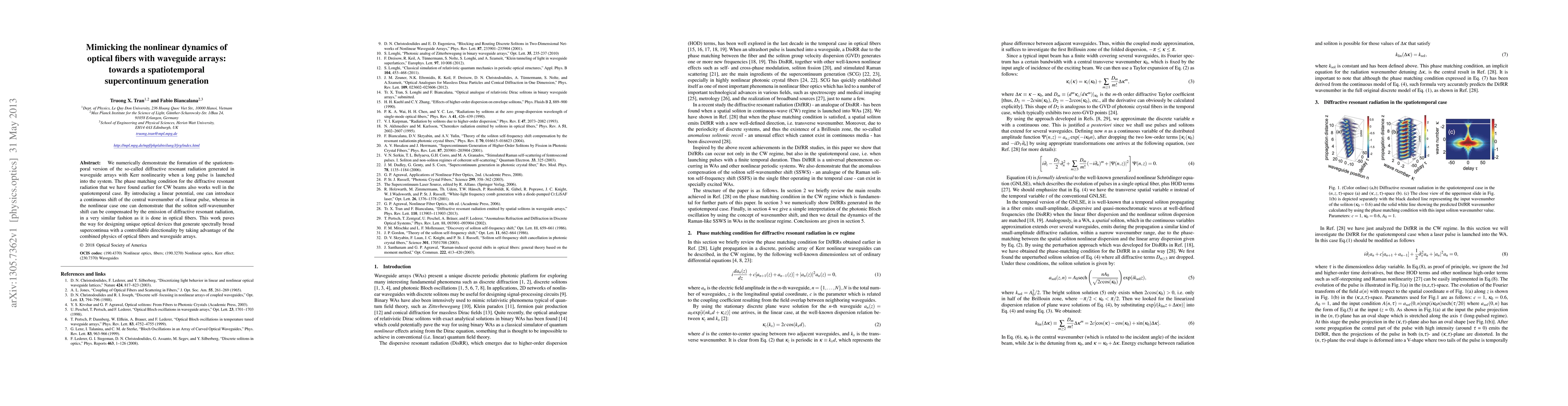We numerically demonstrate the formation of the spatiotemporal version of the so-called diffractive resonant radiation generated in waveguide arrays with Kerr nonlinearity when a long pulse is launched into the system. The phase matching condition for the diffractive resonant radiation that we have found earlier for CW beams also works well in the spatiotemporal case. By introducing a linear potential, one can introduce a continuous shift of the central wavenumber of a linear pulse, whereas in the nonlinear case one can demonstrate that the soliton self-wavenumber shift can be compensated by the emission of diffractive resonant radiation, in a very similar fashion as it is done in optical fibers. This work paves the way for designing unique optical devices that generate spectrally broad supercontinua with a controllable directionality by taking advantage of the combined physics of optical fibers and waveguide arrays.