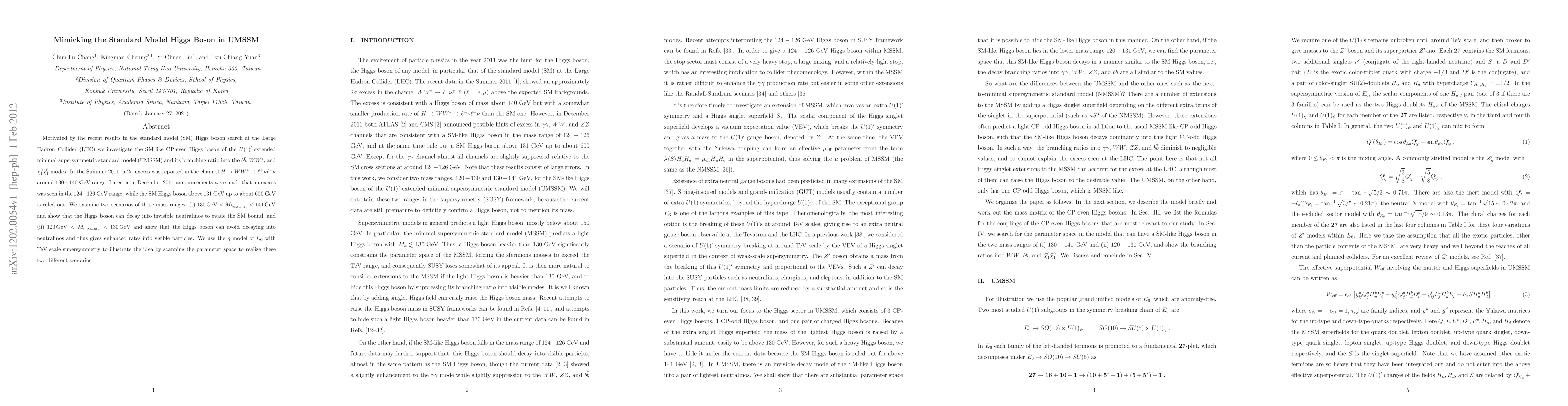 Motivated by the recent results in the standard model (SM) Higgs boson search at the Large Hadron Collider (LHC) we investigate the SM-like CP-even Higgs boson of the U(1)'-extended minimal supersymmetric standard model (UMSSM) and its branching ratio into the b b-bar, W W*, and \chi^0_1 \chi^0_1 modes. In the Summer 2011, a 2 sigma excess was reported in the channel H -> W W* -> l+ nu l- nu-bar around 130 - 140 GeV range. Later on in December 2011 announcements were made that an excess was seen in the 124-126 GeV range, while the SM Higgs boson above 131 GeV up to about 600 GeV is ruled out. We examine two scenarios of these mass ranges: (i) 130 GeV < M_{h_{SM-like}} < 141 GeV and show that the Higgs boson can decay into invisible neutralinos to evade the SM bound; and (ii) 120 GeV < M_{h_{\rm SM-like}} < 130 GeV and show that the Higgs boson can avoid decaying into neutralinos and thus gives enhanced rates into visible particles. We use the \eta model of E_6 with TeV scale supersymmetry to illustrate the idea by scanning the parameter space to realize these two different scenarios.
