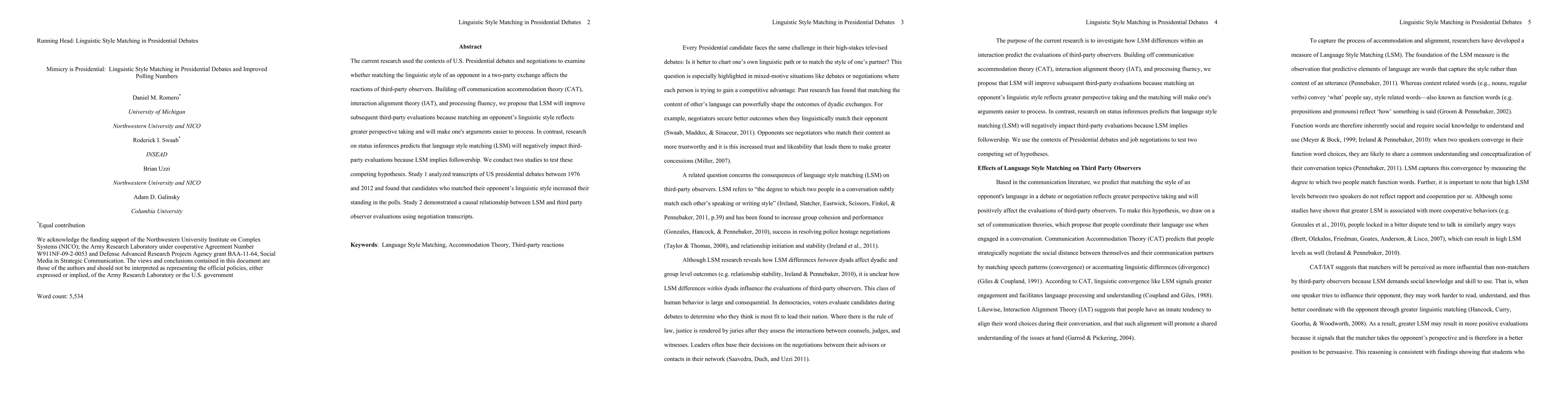 This research investigates whether matching an opponent's linguistic style during U.S. presidential debates enhances third-party observers' evaluations, finding that language style matching correlates with improved polling numbers. The study supports the hypothesis that LSM reflects perspective taking and processing fluency, countering predictions of negative status inferences.