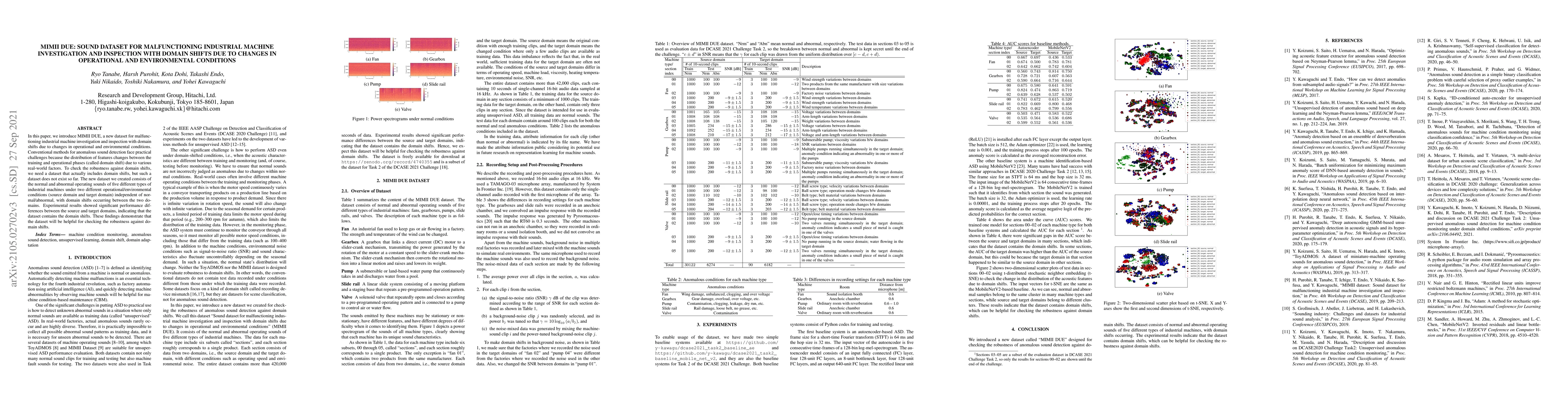 This paper introduces MIMII DUE, a dataset for investigating and inspecting malfunctioning industrial machines, featuring domain shifts due to operational and environmental changes. The dataset, which includes normal and abnormal sounds from five machines under different conditions, demonstrates significant performance differences between source and target domains, highlighting its utility for assessing robustness against domain shifts.