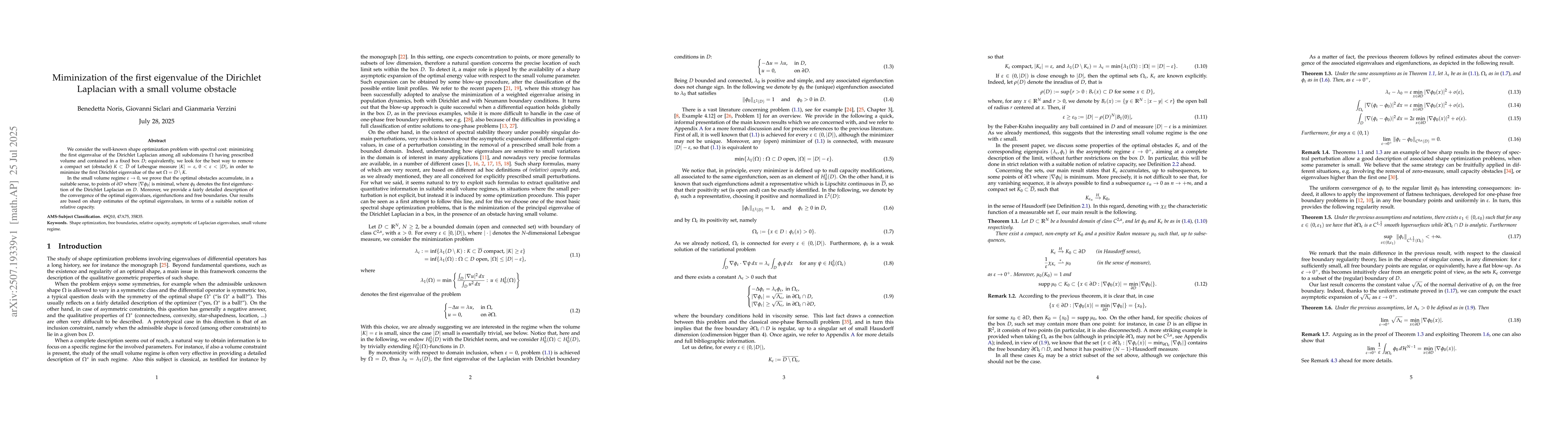 We consider the well-known shape optimization problem with spectral cost: minimizing the first eigenvalue of the Dirichlet Laplacian among all subdomains $\Omega$ having prescribed volume and contained in a fixed box $D$; equivalently, we look for the best way to remove a compact set (obstacle) $K\subset\overline{D}$ of Lebesgue measure $|K|=\varepsilon$, $0<\varepsilon<|D|$, in order to minimize the first Dirichlet eigenvalue of the set $\Omega = D \setminus K$. In the small volume regime $\varepsilon\to0$, we prove that the optimal obstacles accumulate, in a suitable sense, to points of $\partial D$ where $|\nabla \phi_0|$ is minimal, where $\phi_0$ denotes the first eigenfunction of the Dirichlet Laplacian on $D$. Moreover, we provide a fairly detailed description of the convergence of the optimal eigenvalues, eigenfunctions and free boundaries. Our results are based on sharp estimates of the optimal eigenvalues, in terms of a suitable notion of relative capacity.