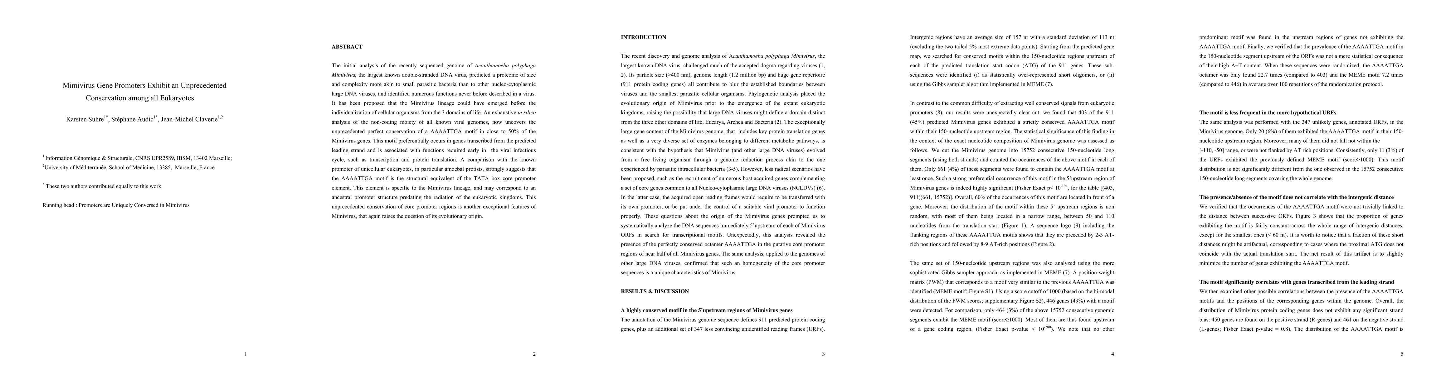 A recent analysis found that the Mimivirus gene promoters exhibit an unprecedented 50% conservation among all eukaryotes, with a specific motif suggesting an ancestral promoter structure predating the radiations of eukaryotic kingdoms.