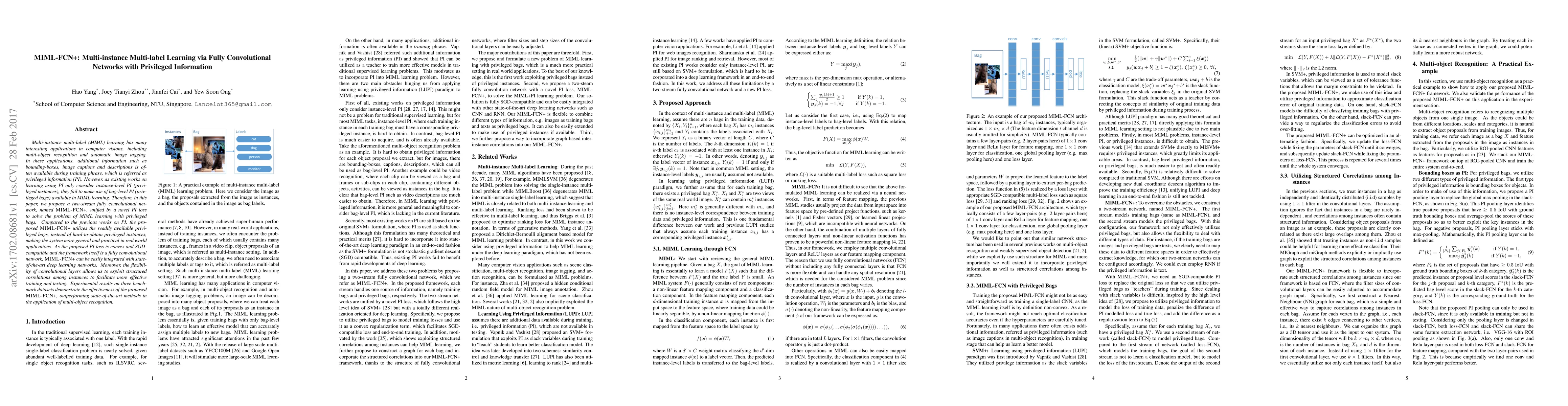 This paper proposes MIML-FCN+, a two-stream fully convolutional network for multi-instance multi-label learning that leverages privileged information at both instance and bag levels. The method outperforms existing techniques by utilizing bag-level privileged information, demonstrating superior performance in multi-object recognition tasks on benchmark datasets.