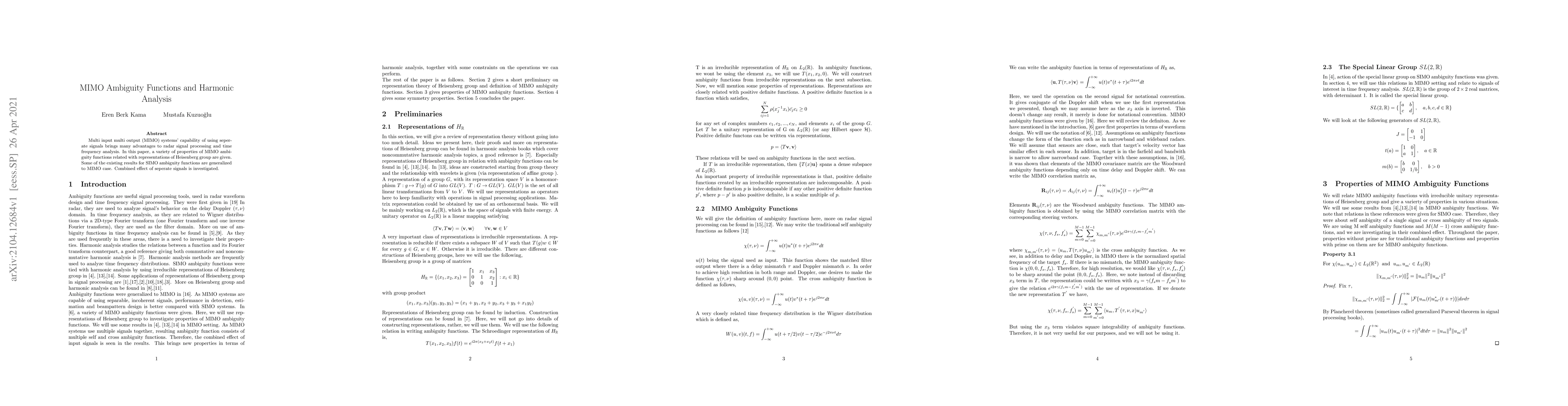 This paper explores the properties of MIMO ambiguity functions in radar signal processing, linking them to representations of the Heisenberg group. It generalizes existing SIMO results to the MIMO context and investigates the combined effects of separate signals in MIMO systems.