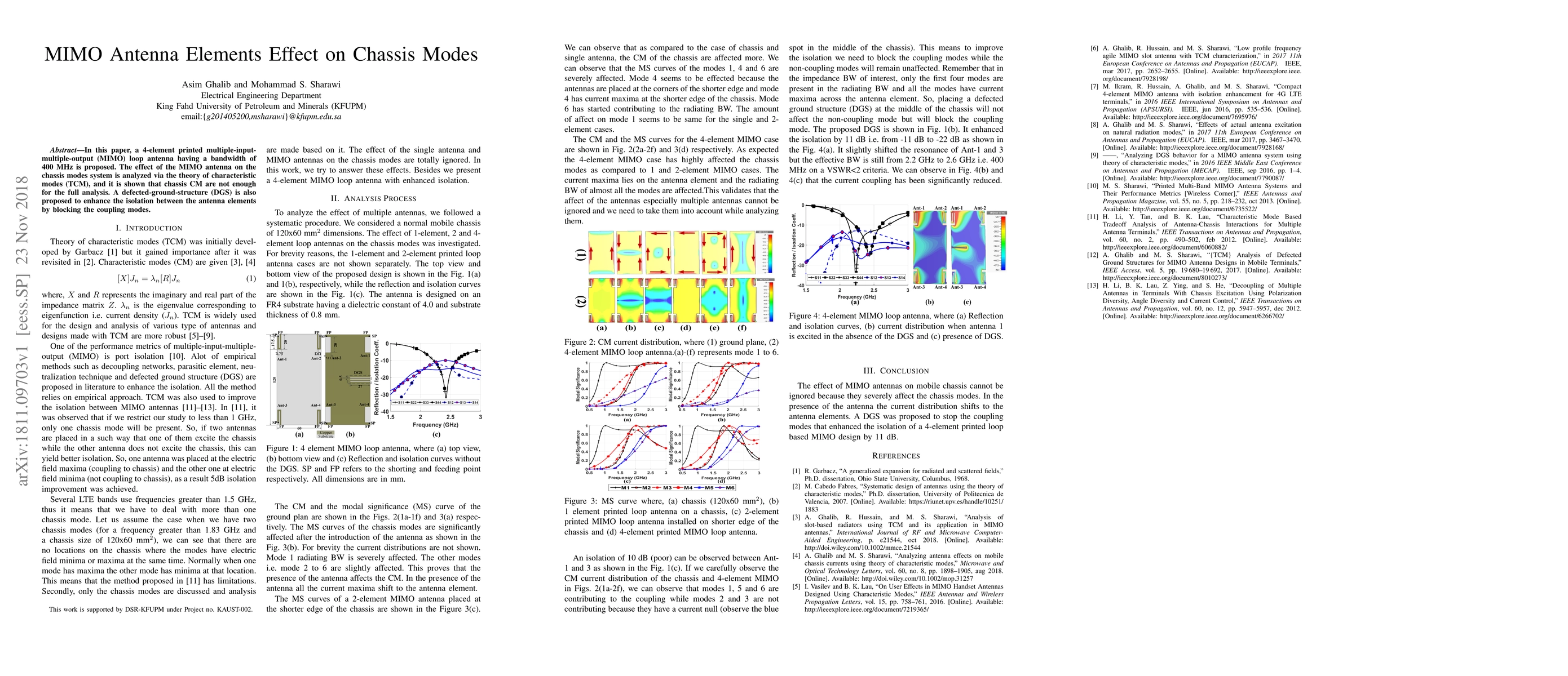 This paper proposes a 4-element MIMO loop antenna and analyzes its impact on chassis modes using the theory of characteristic modes. It finds that chassis modes alone are insufficient and introduces a defected-ground-structure to improve antenna element isolation.