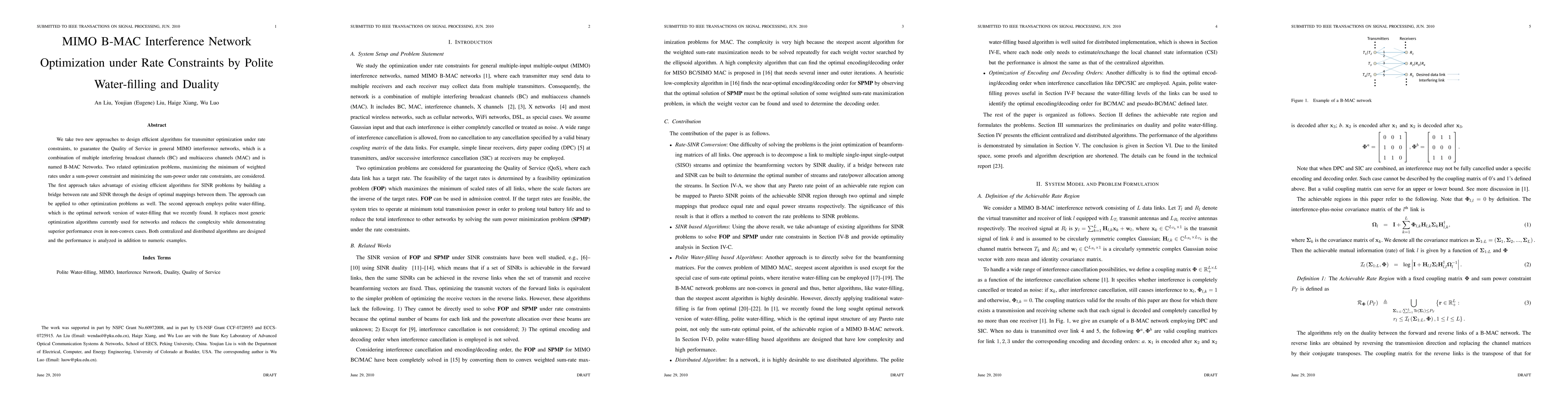 This paper proposes two novel algorithms for optimizing transmitters in MIMO B-MAC interference networks under rate constraints, employing polite water-filling and duality. The approaches maximize minimum weighted rates and minimize sum-power, demonstrating superior performance and reduced complexity.