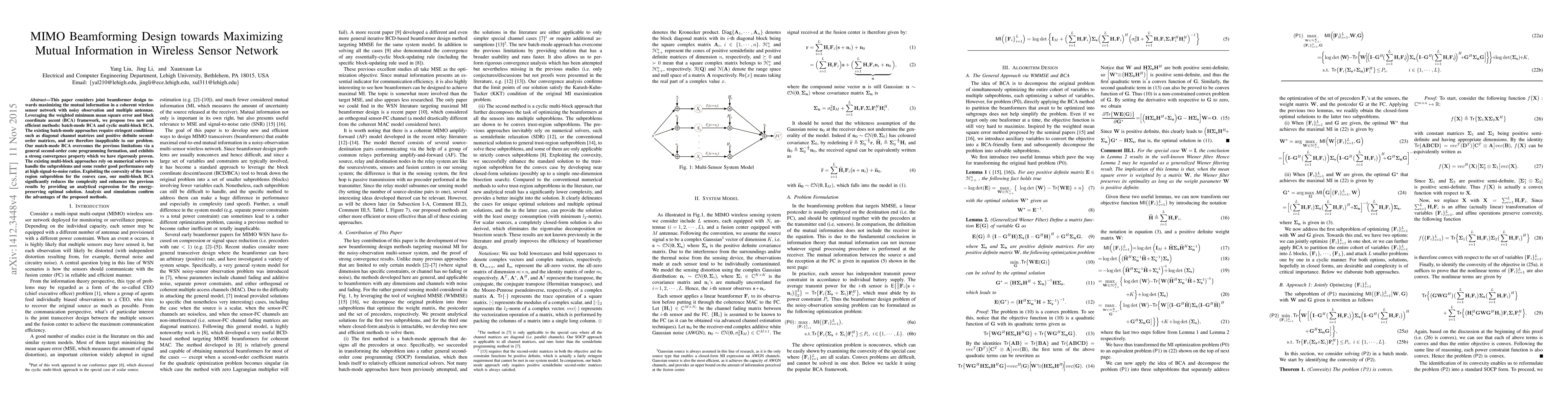 This paper proposes two efficient methods for maximizing mutual information in wireless sensor networks using MIMO beamforming, overcoming previous limitations with a new framework for joint design.