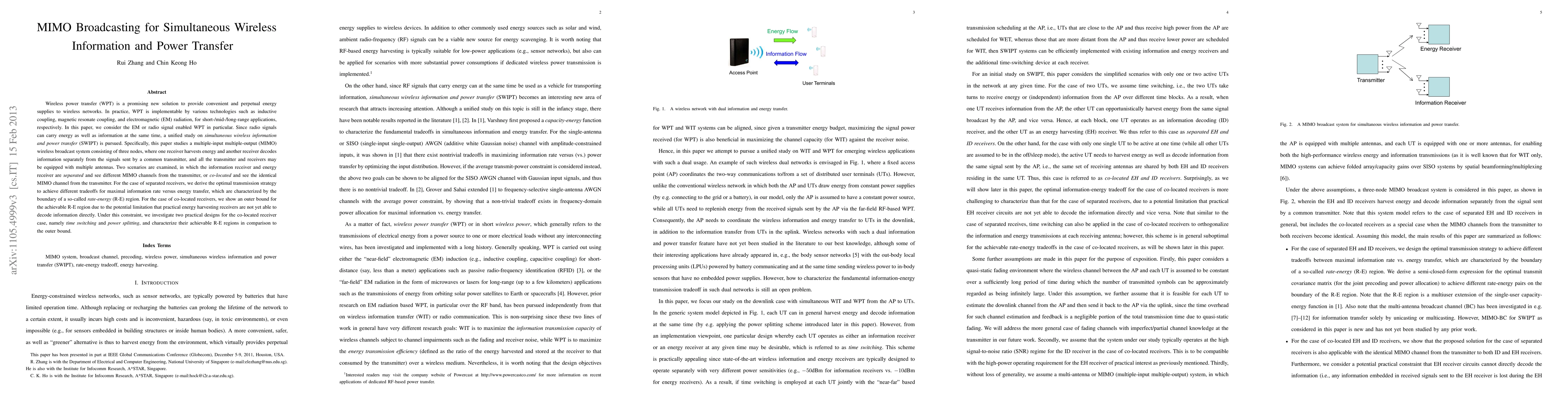 This paper explores simultaneous wireless information and power transfer (SWIPT) in a MIMO broadcasting system, focusing on radio signal-enabled wireless power transfer. It examines two scenarios for receivers: separated and co-located, deriving optimal strategies and characterizing achievable rate-energy regions, and investigating practical designs like time switching and power splitting for co-located receivers.