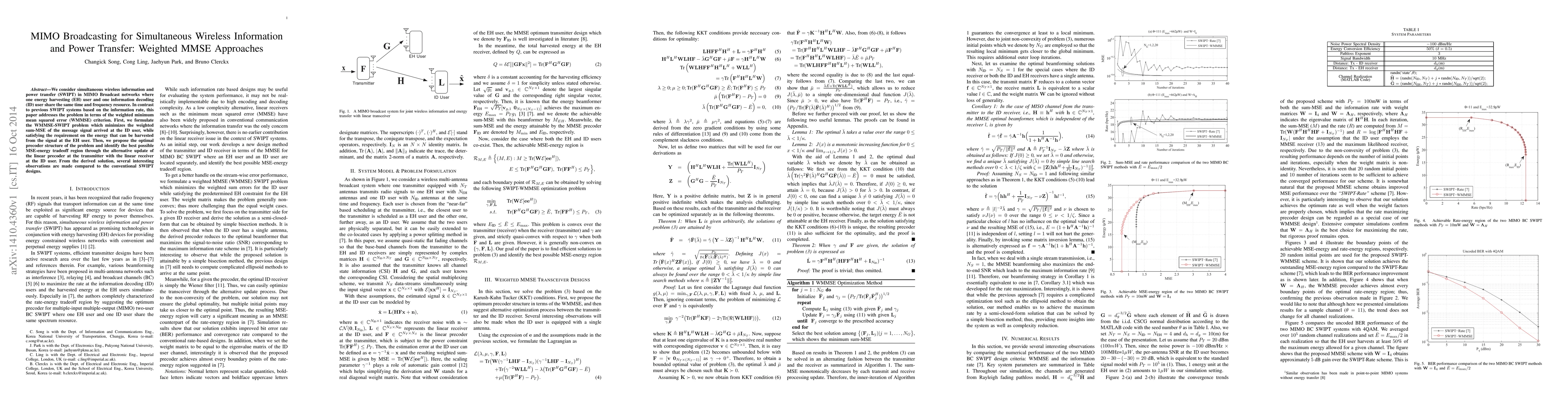 This paper explores MIMO broadcasting for SWIPT in networks with energy harvesting and information decoding users. It formulates the optimal precoder structure based on the weighted minimum mean squared error criterion, optimizing the MSE-energy tradeoff and identifying the best MSE-energy region.