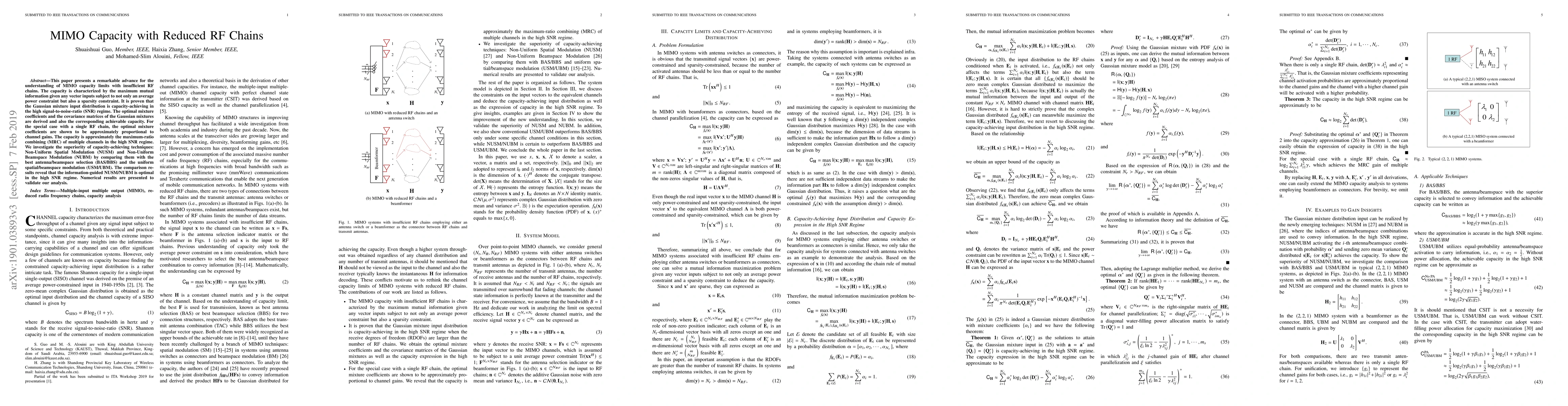 This paper presents a remarkable advance for the understanding of MIMO capacity limits with insufficient RF chains. The capacity is characterized by the maximum mutual information given any vector inputs subject to not only an average power constraint but also a sparsity constraint. It is proven that the Gaussian mixture input distribution is capacity-achieving in the high signal-to-noise-ratio (SNR) regime. The optimal mixture coefficients and the covariance matrices of the Gaussian mixtures are derived and also the corresponding achievable capacity. For the special case with a single RF chain, the optimal mixture coefficients are shown to be approximately proportional to channel gains. The capacity is approximately the maximum-ratio combining (MRC) of multiple channels in the high SNR regime. We investigate the superiority of capacity-achieving techniques: Non-Uniform Spatial Modulation (NUSM) and Non-Uniform Beamspace Modulation (NUBM) by comparing them with the best antenna/beamspace selection (BAS/BBS) and the uniform spatial/beamspace modulation (USM/UBM). The comparison results reveal that the information-guided NUSM/NUBM is optimal in the high SNR regime. Numerical results are presented to validate our analysis.