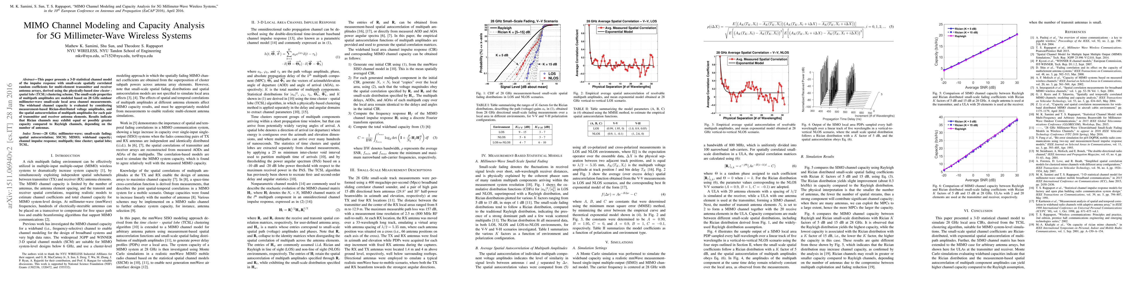 This paper presents a 3-D statistical channel model of the impulse response with small-scale spatially correlated random coefficients for multi-element transmitter and receiver antenna arrays, derived using the physically-based time cluster - spatial lobe (TCSL) clustering scheme. The small-scale properties of multipath amplitudes are modeled based on 28 GHz outdoor millimeter-wave small-scale local area channel measurements. The wideband channel capacity is evaluated by considering measurement-based Rician-distributed voltage amplitudes, and the spatial autocorrelation of multipath amplitudes for each pair of transmitter and receiver antenna elements. Results indicate that Rician channels may exhibit equal or possibly greater capacity compared to Rayleigh channels, depending on the number of antennas.