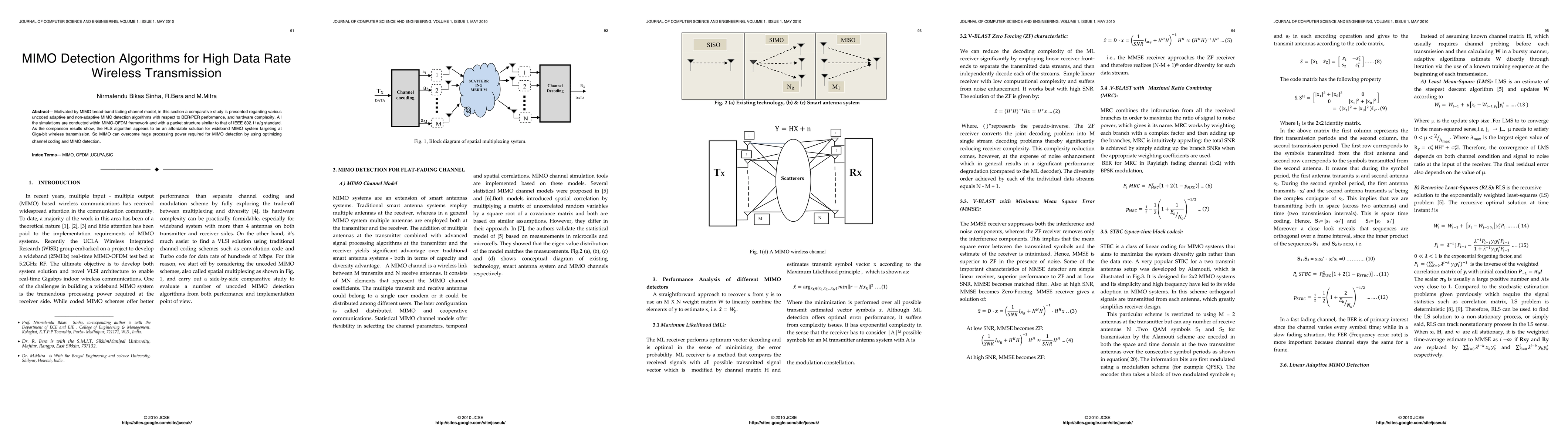 Motivated by MIMO broad-band fading channel model, in this section a comparative study is presented regarding various uncoded adaptive and non-adaptive MIMO detection algorithms with respect to BER/PER performance, and hardware complexity. All the simulations are conducted within MIMO-OFDM framework and with a packet structure similar to that of IEEE 802.11a/g standard. As the comparison results show, the RLS algorithm appears to be an affordable solution for wideband MIMO system targeting at Giga-bit wireless transmission. So MIMO can overcome huge processing power required for MIMO detection by using optimizing channel coding and MIMO detection.