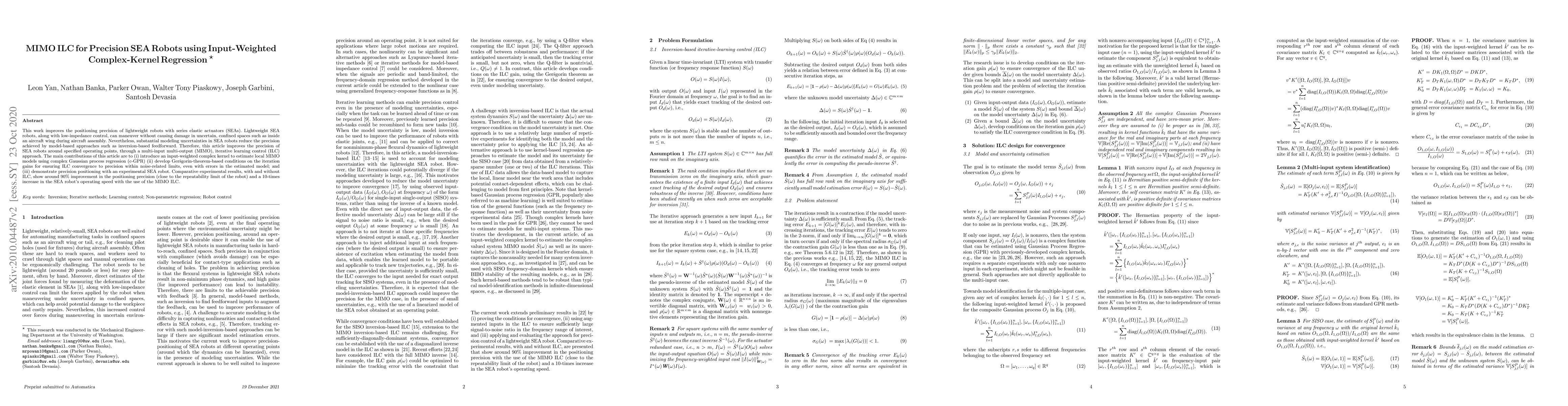 This work improves the positioning precision of lightweight robots with series elastic actuators (SEAs). Lightweight SEA robots, along with low-impedance control, can maneuver without causing damage in uncertain, confined spaces such as inside an aircraft wing during aircraft assembly. Nevertheless, substantial modeling uncertainties in SEA robots reduce the precision achieved by model-based approaches such as inversion-based feedforward. Therefore, this article improves the precision of SEA robots around specified operating points, through a multi-input multi-output (MIMO), iterative learning control (ILC) approach. The main contributions of this article are to (i) introduce an input-weighted complex kernel to estimate local MIMO models using complex Gaussian process regression (c-GPR) (ii) develop Ger\v{s}gorin-theorem-based conditions on the iteration gains for ensuring ILC convergence to precision within noise-related limits, even with errors in the estimated model; and (iii) demonstrate precision positioning with an experimental SEA robot. Comparative experimental results, with and without ILC, show around 90% improvement in the positioning precision (close to the repeatability limit of the robot) and a 10-times increase in the SEA robot's operating speed with the use of the MIMO ILC.