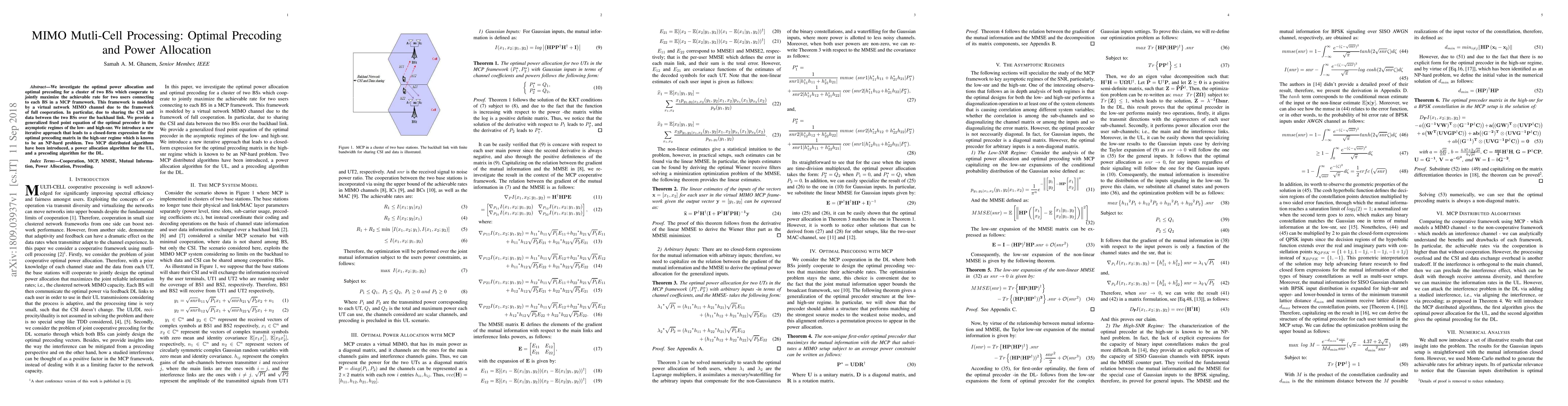 We investigate the optimal power allocation and optimal precoding for a cluster of two BSs which cooperate to jointly maximize the achievable rate for two users connecting to each BS in a MCP framework. This framework is modeled by a virtual network MIMO channel due to the framework of full cooperation. In particular, due to sharing the CSI and data between the two BSs over the backhaul link. We provide a generalized fixed point equation of the optimal precoder in the asymptotic regimes of the low- and high-snr. We introduce a new iterative approach that leads to a closed-form expression for the optimal precoding matrix in the high-snr regime which is known to be an NP-hard problem. Two MCP distributed algorithms have been introduced, a power allocation algorithm for the UL, and a precoding algorithm for the DL.