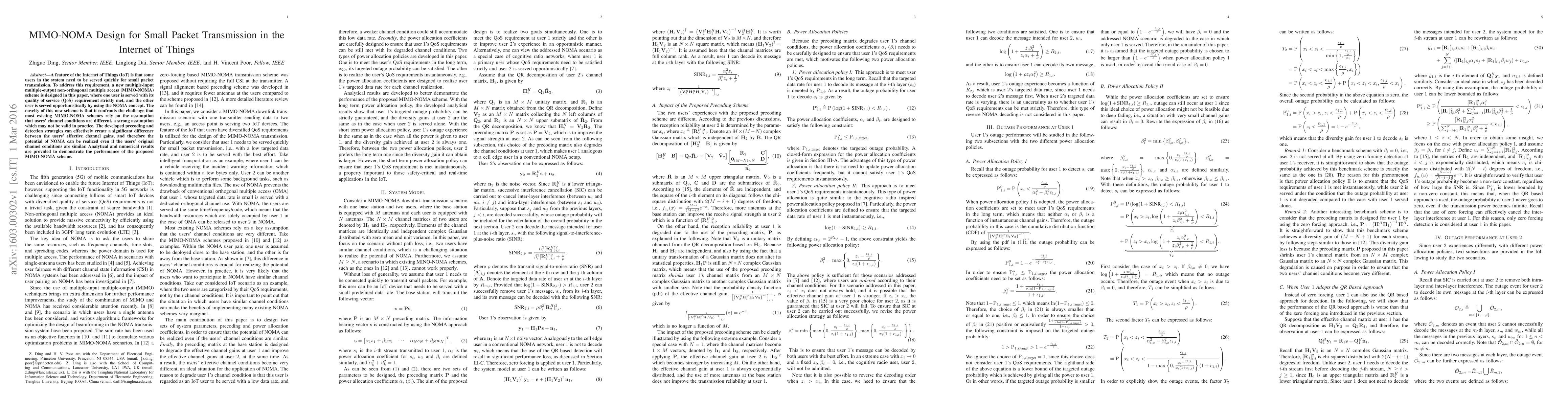 A feature of the Internet of Things (IoT) is that some users in the system need to be served quickly for small packet transmission. To address this requirement, a new multiple-input multiple-output non-orthogonal multiple access (MIMO-NOMA) scheme is designed in this paper, where one user is served with its quality of service (QoS) requirement strictly met, and the other user is served opportunistically by using the NOMA concept. The novelty of this new scheme is that it confronts the challenge that most existing MIMO-NOMA schemes rely on the assumption that users' channel conditions are different, a strong assumption which may not be valid in practice. The developed precoding and detection strategies can effectively create a significant difference between the users' effective channel gains, and therefore the potential of NOMA can be realized even if the users' original channel conditions are similar. Analytical and numerical results are provided to demonstrate the performance of the proposed MIMO-NOMA scheme.