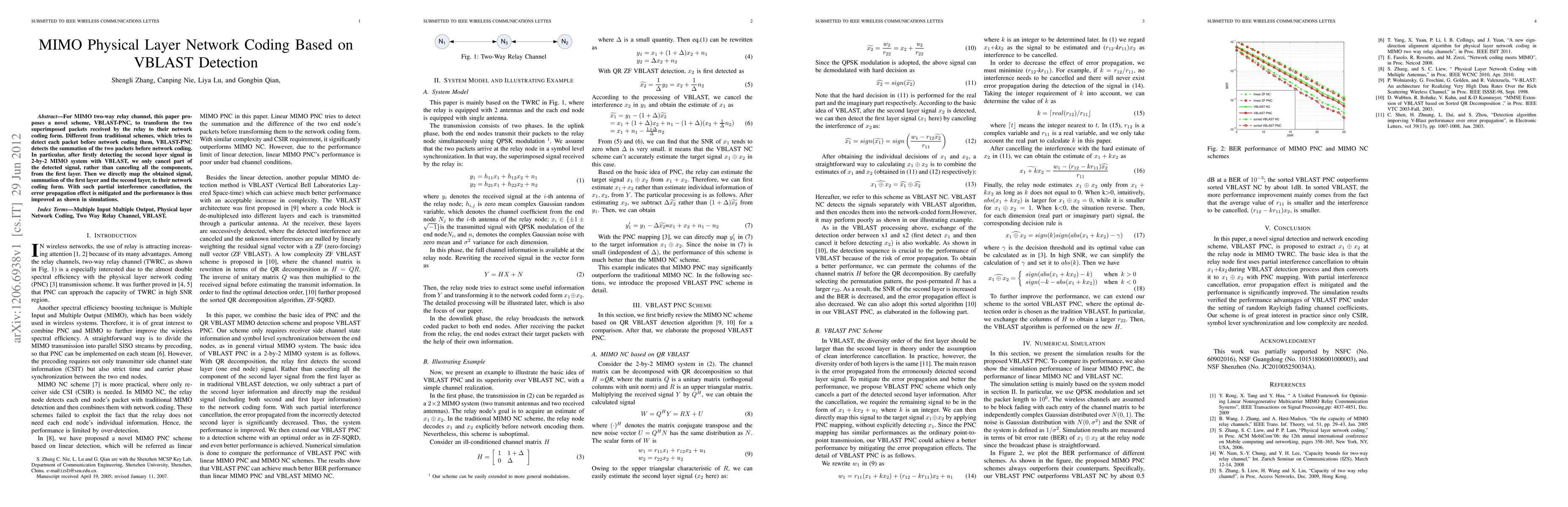 For MIMO two-way relay channel, this paper proposes a novel scheme, VBLAST-PNC, to transform the two superimposed packets received by the relay to their network coding form. Different from traditional schemes, which tries to detect each packet before network coding them, VBLAST-PNC detects the summation of the two packets before network coding. In particular, after firstly detecting the second layer signal in 2-by-2 MIMO system with VBLAST, we only cancel part of the detected signal, rather than canceling all the components, from the first layer. Then we directly map the obtained signal, summation of the first layer and the second layer, to their network coding form. With such partial interference cancellation, the error propagation effect is mitigated and the performance is thus improved as shown in simulations.