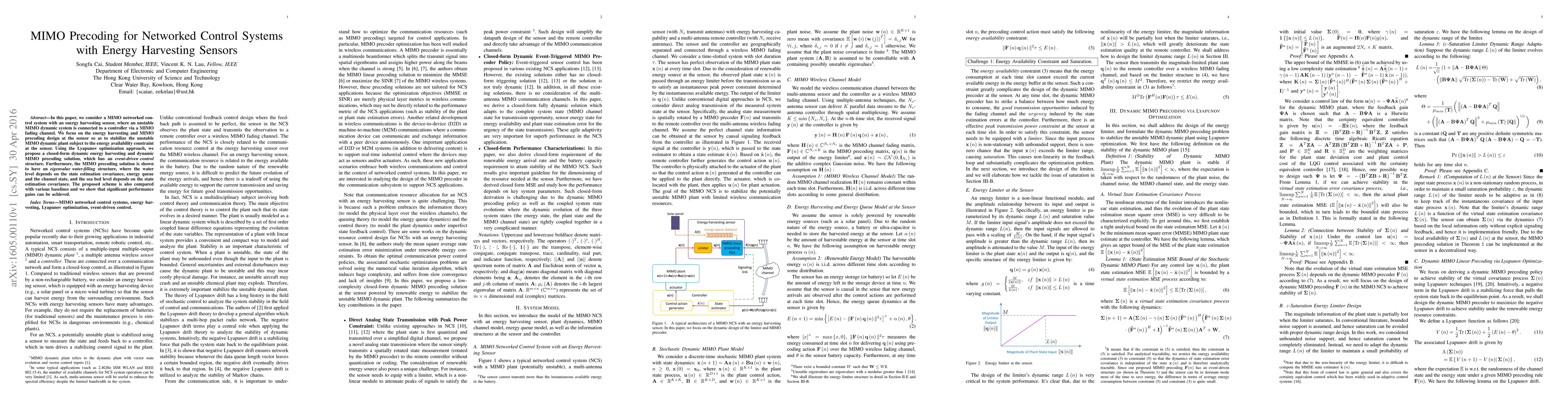 This paper proposes a Lyapunov optimization-based approach for MIMO precoding and dynamic energy harvesting in networked control systems with an energy harvesting sensor. The solution features an event-driven control structure and an eigenvalue water-filling MIMO precoding design, achieving significant performance gains over baseline methods.