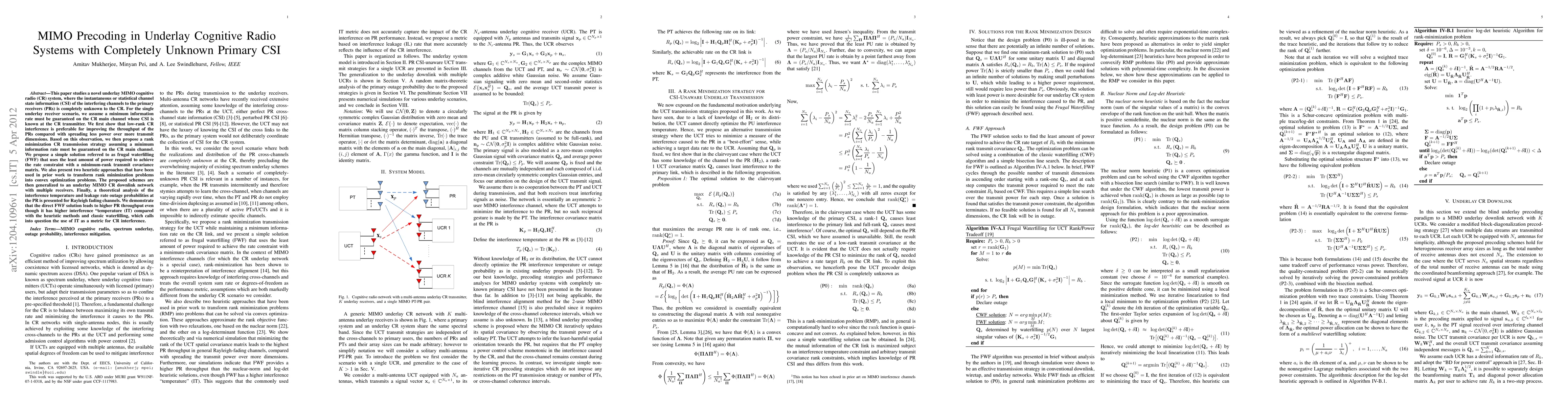 This paper proposes a novel underlay MIMO cognitive radio system with completely unknown primary channel state information, introducing a rank minimization strategy to maximize primary receiver throughput while ensuring a minimum information rate on the CR main channel. The proposed frugal waterfilling method optimizes power usage and demonstrates higher primary throughput despite higher interference levels, challenging the use of interference temperature as a sole metric.