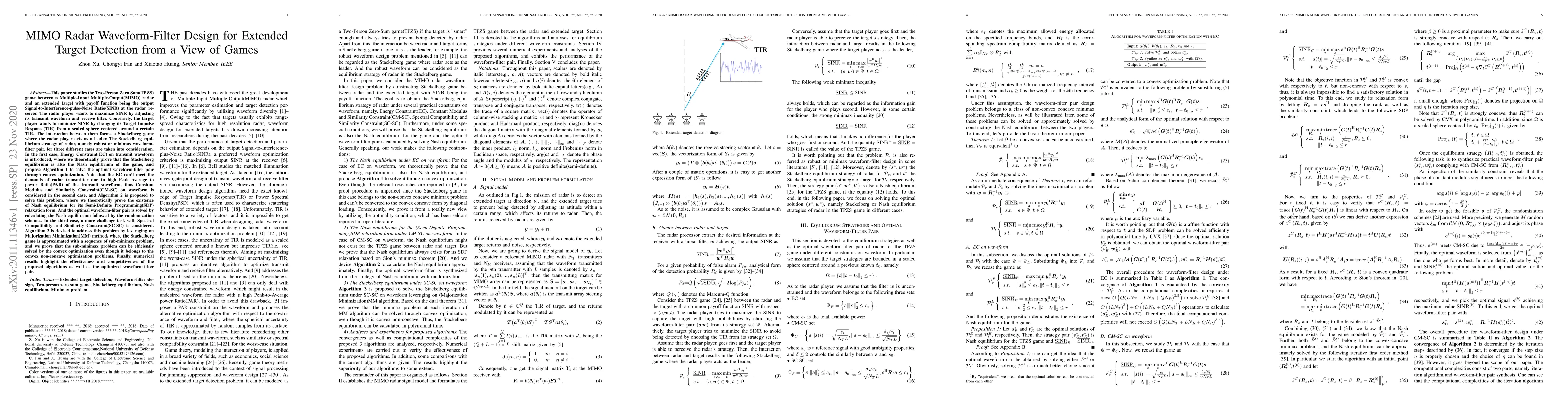 This paper explores the design of MIMO radar waveforms and filters through a Stackelberg game framework to maximize Signal-to-Interference-pulse-Noise Ratio (SINR) for extended target detection. The radar aims to optimize SINR while the target seeks to minimize it, with the radar acting as the leader. Three cases are analyzed, including Energy Constraint and Constant Modulus and Similarity Constraint scenarios, each with respective algorithms to find optimal solutions.
