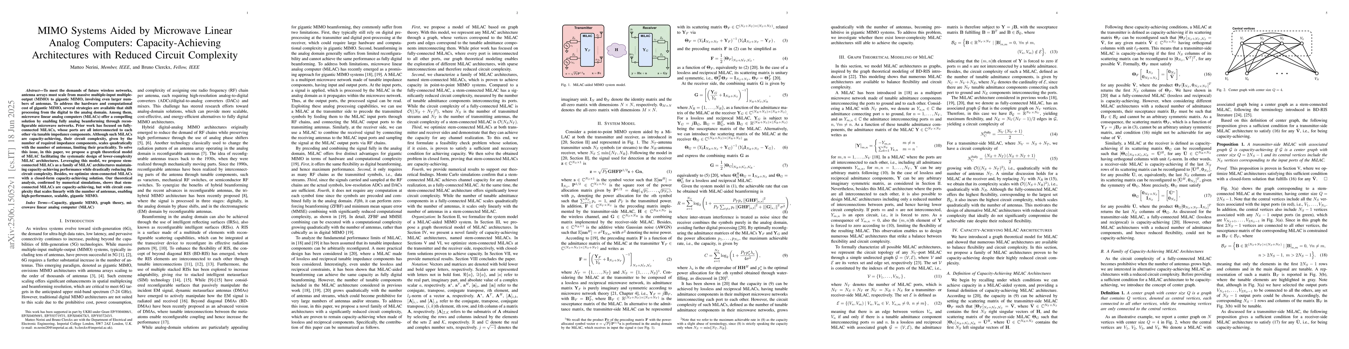 To meet the demands of future wireless networks, antenna arrays must scale from massive multiple-input multiple-output (MIMO) to gigantic MIMO, involving even larger numbers of antennas. To address the hardware and computational cost of gigantic MIMO, several strategies are available that shift processing from the digital to the analog domain. Among them, microwave linear analog computers (MiLACs) offer a compelling solution by enabling fully analog beamforming through reconfigurable microwave networks. Prior work has focused on fully-connected MiLACs, whose ports are all interconnected to each other via tunable impedance components. Although such MiLACs are capacity-achieving, their circuit complexity, given by the number of required impedance components, scales quadratically with the number of antennas, limiting their practicality. To solve this issue, in this paper, we propose a graph theoretical model of MiLAC facilitating the systematic design of lower-complexity MiLAC architectures. Leveraging this model, we propose stem-connected MiLACs as a family of MiLAC architectures maintaining capacity-achieving performance while drastically reducing the circuit complexity. Besides, we optimize stem-connected MiLACs with a closed-form capacity-achieving solution. Our theoretical analysis, confirmed by numerical simulations, shows that stem-connected MiLACs are capacity-achieving, but with circuit complexity that scales linearly with the number of antennas, enabling high-performance, scalable, gigantic MIMO.