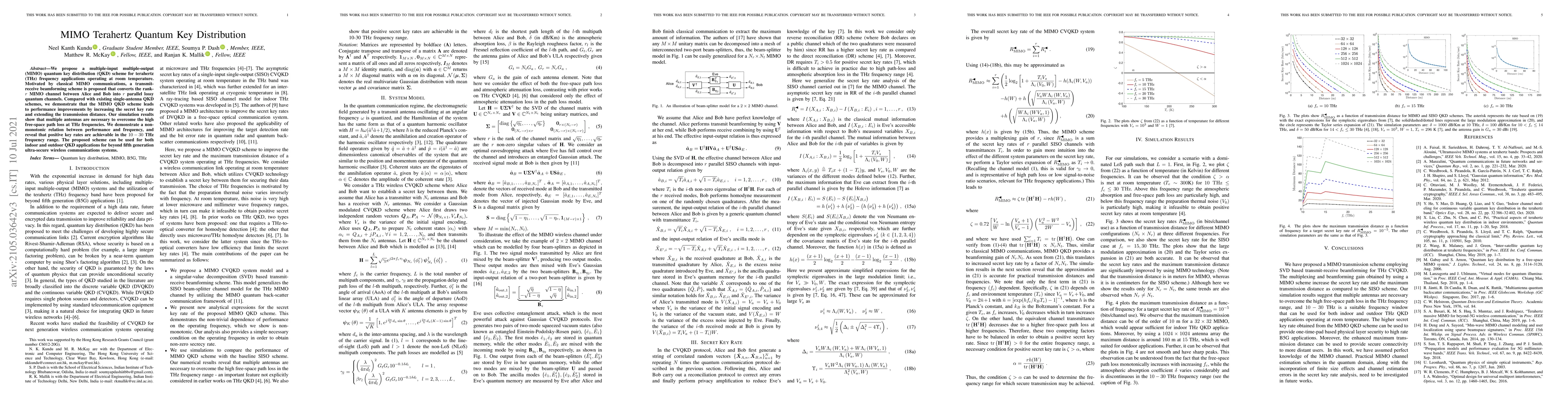 This paper proposes a MIMO quantum key distribution scheme for terahertz frequency applications, demonstrating improved secret key rates and extended transmission distances compared to single-antenna QKD. The scheme utilizes beamforming to convert the MIMO channel into parallel quantum channels, showing positive key rates achievable in the 10-30 THz range.