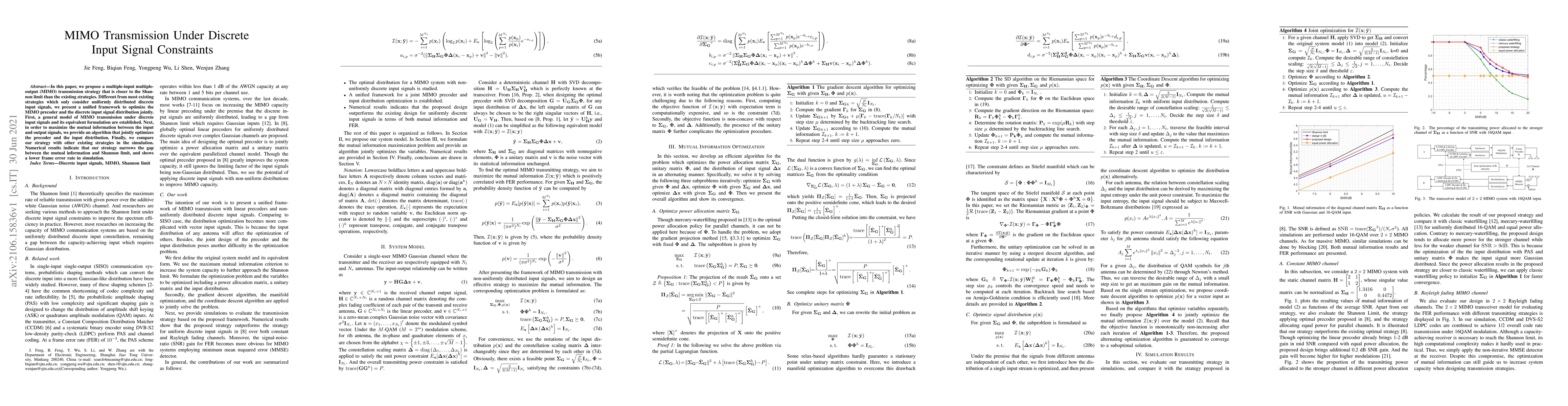 This paper proposes a novel MIMO transmission strategy that optimizes both the MIMO precoder and the discrete input signal distribution jointly to approach the Shannon limit. Simulation results show that this approach reduces the gap to the Shannon limit and lowers the frame error rate compared to existing methods.