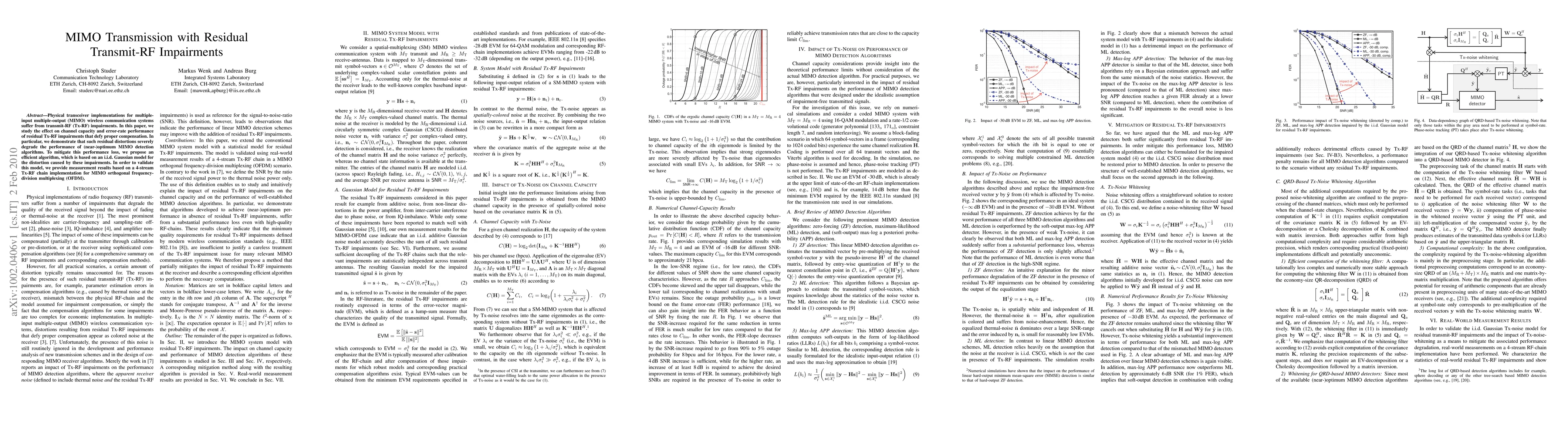 This paper investigates the impact of residual transmit-RF impairments on MIMO wireless communication systems, showing significant degradation in channel capacity and error rates. To mitigate these effects, the authors propose an efficient algorithm based on an i.i.d. Gaussian model for the impairments, validated through measurements on a 4-stream MIMO OFDM system.