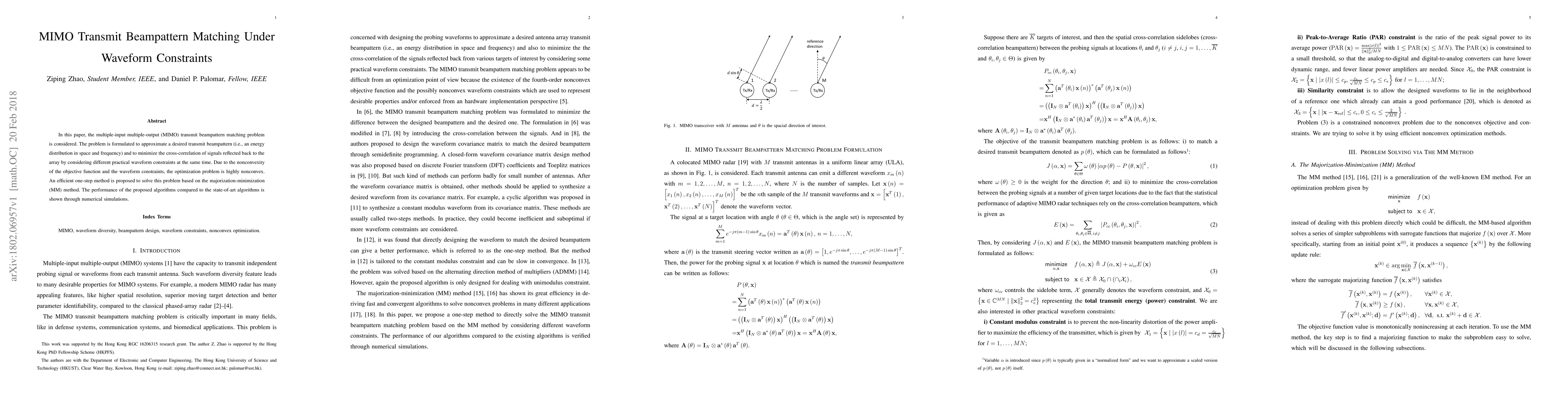 In this paper, the multiple-input multiple-output (MIMO) transmit beampattern matching problem is considered. The problem is formulated to approximate a desired transmit beampattern (i.e., an energy distribution in space and frequency) and to minimize the cross-correlation of signals reflected back to the array by considering different practical waveform constraints at the same time. Due to the nonconvexity of the objective function and the waveform constraints, the optimization problem is highly nonconvex. An efficient one-step method is proposed to solve this problem based on the majorization-minimization (MM) method. The performance of the proposed algorithms compared to the state-of-art algorithms is shown through numerical simulations.